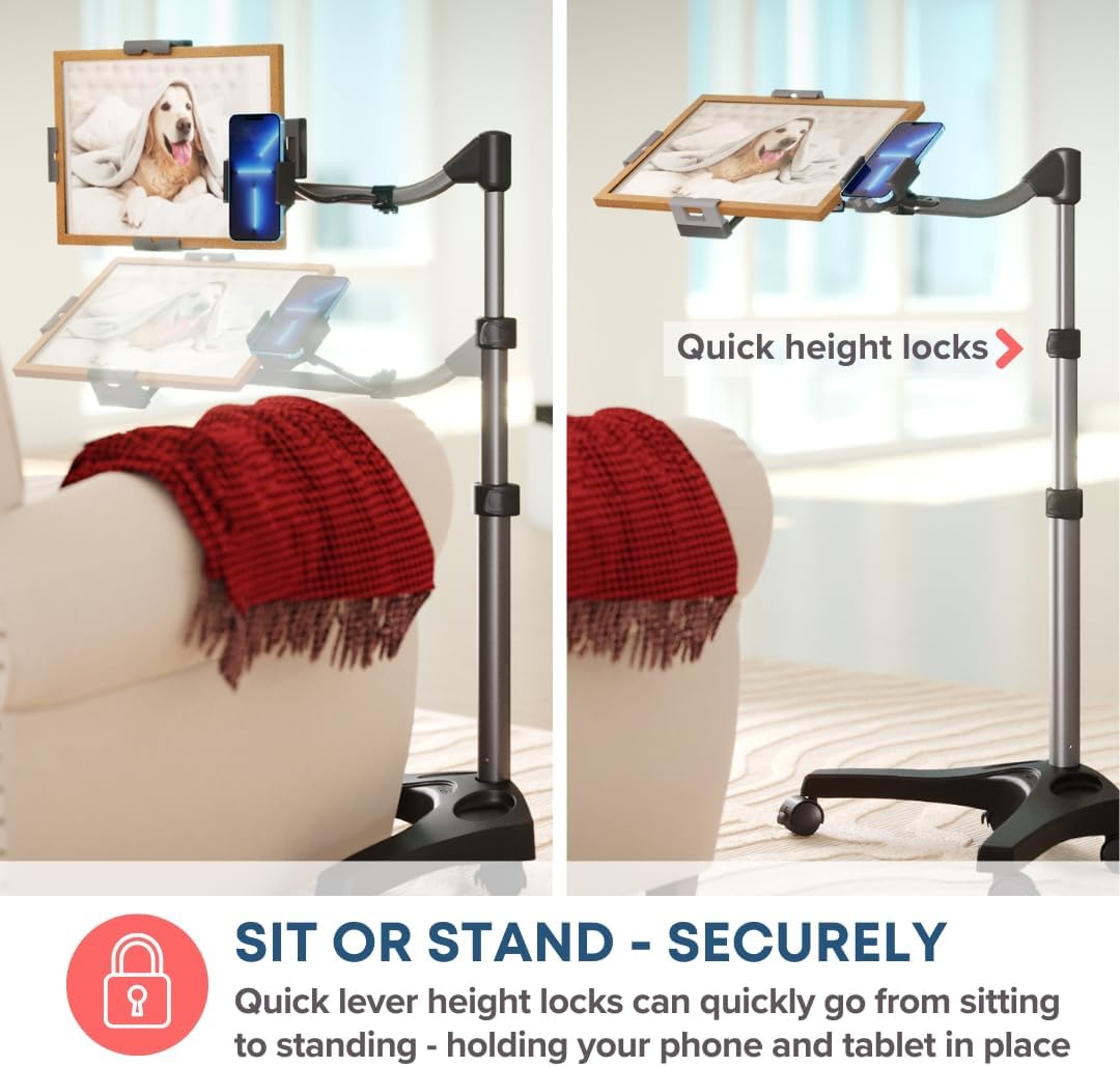 - LATEST DESIGN FOR ULTIMATE COMFORT: Effortlessly position your tablet for use while sitting, standing, or lying in bed. The 15 inch horizontal arm glides smoothly over and between the V-shaped feet of the base, making it ideal for use at the corner of chairs or with furniture that offers base clearance. The desktop tilts up to 70°, stays level with our patented leveling system, and secures your laptop with a safety bungee — so you can work hands-free, wherever you're most comfortable.
