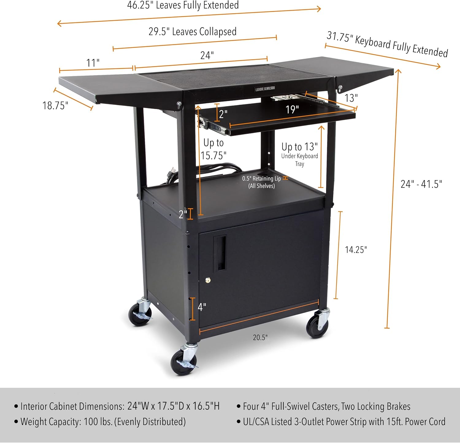 Line Leader Rolling AV Cart with Locking Cabinet, Laptop Stand, and Drop Leaves, Height Adjustable Mobile Utility Cart Workstation with Extra Storage Space, UL-Listed Power Strip (Black / 46 x 18)