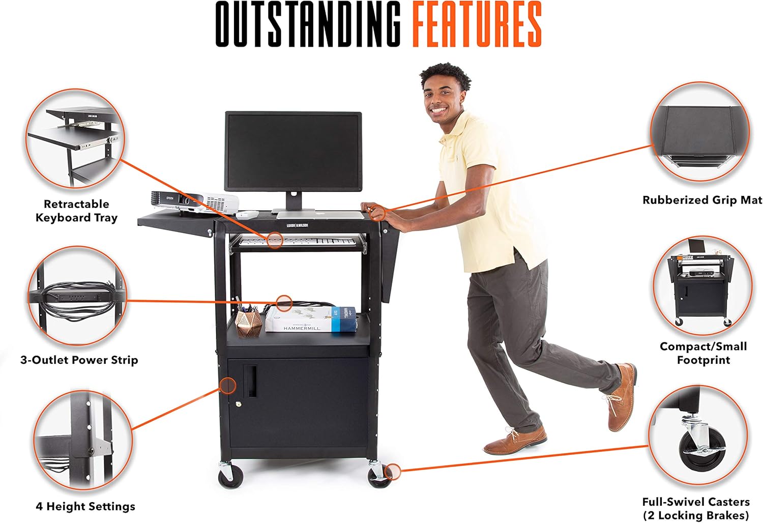 - Secure Lockable Cabinet - Our Line Leader Rolling AV Cart features a lockable cabinet, ensuring safe storage for your valuable equipment while moving from one room to another.