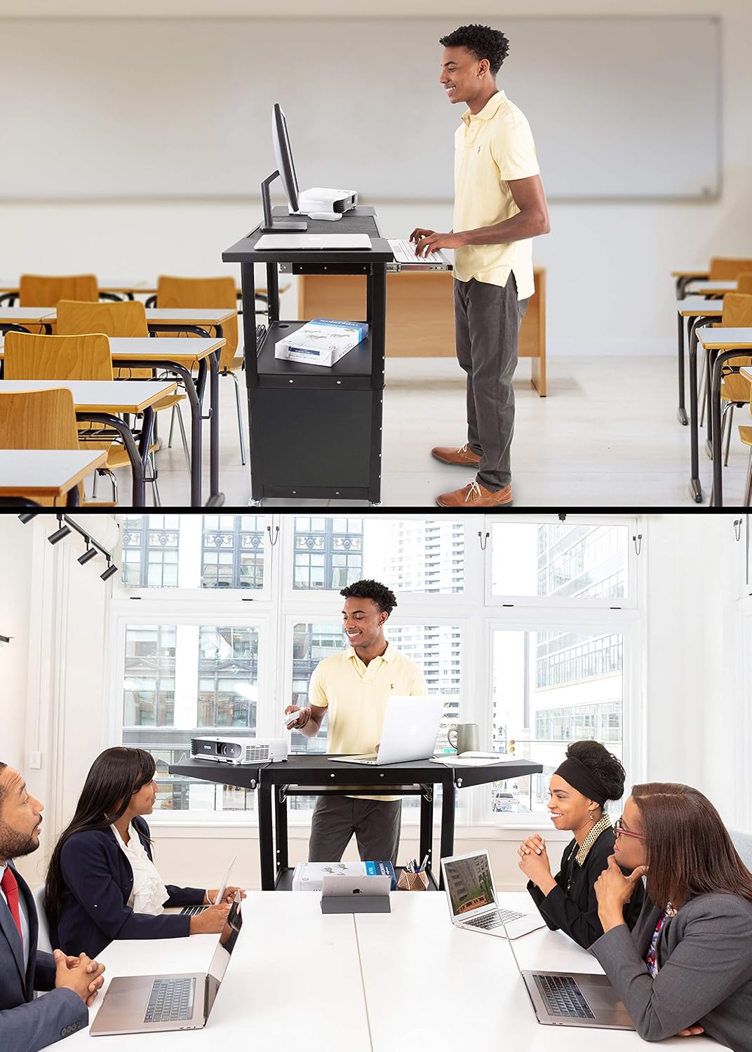 - Enhanced Workspace - Experience added convenience on our rolling computer stand with pullout trays and drop leaf side shelves for multiple screens, laptops, or projectors, enhancing your AV cart's utility and space.