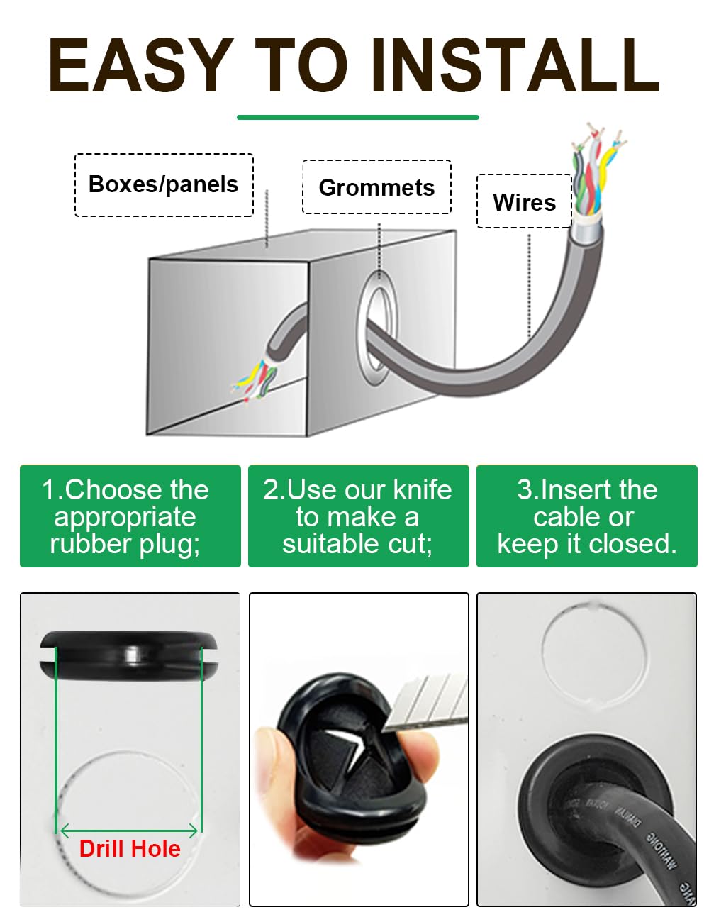 - Function: Rubber cable hole plugs are dust-proof, insulated, flame-retardant; This rubber grommet assortment kit helps protect wire and cable from sharp metal edges According to the thickness of the cable, the diameter of the rubber plugs for holes can be freely cut to and protect the cable from dust and rain