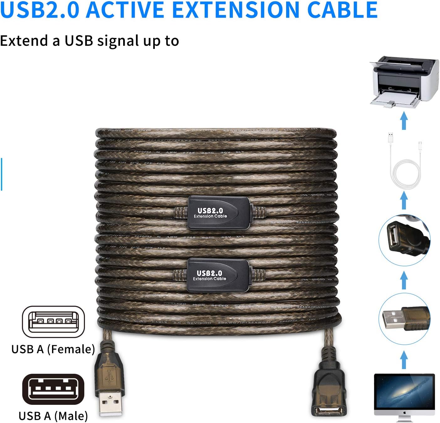 - 【FLEXIBLE&DURABLE】: With metal wire braid inside, the cable is flexible and resistant to pull and drag. The gold-plated connectors can bear more than 10000 times plug. The ABS and PVC case is anti-abrasive. UNIVERSAL COMPATIBILITY: The USB active extender is broadly compatible with Windows, Mac, Linux, Chromebook, and USB 2.0 peripherals including hard drives, USB hubs, mice, keyboards, flash drives, printers, and more.