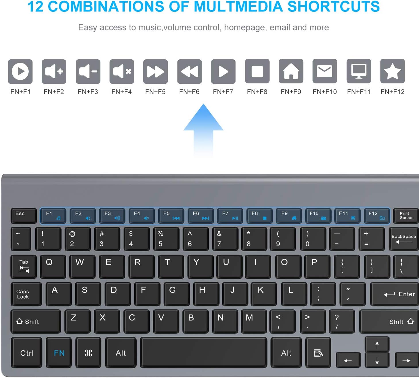 - Easy to Use: LeadsaiL wireless keyboard features 12 multimedia shortcuts allowing instant access to play, pause, previous, next, volume, mute and more. (Note: this function is not compatible with Mac OS).