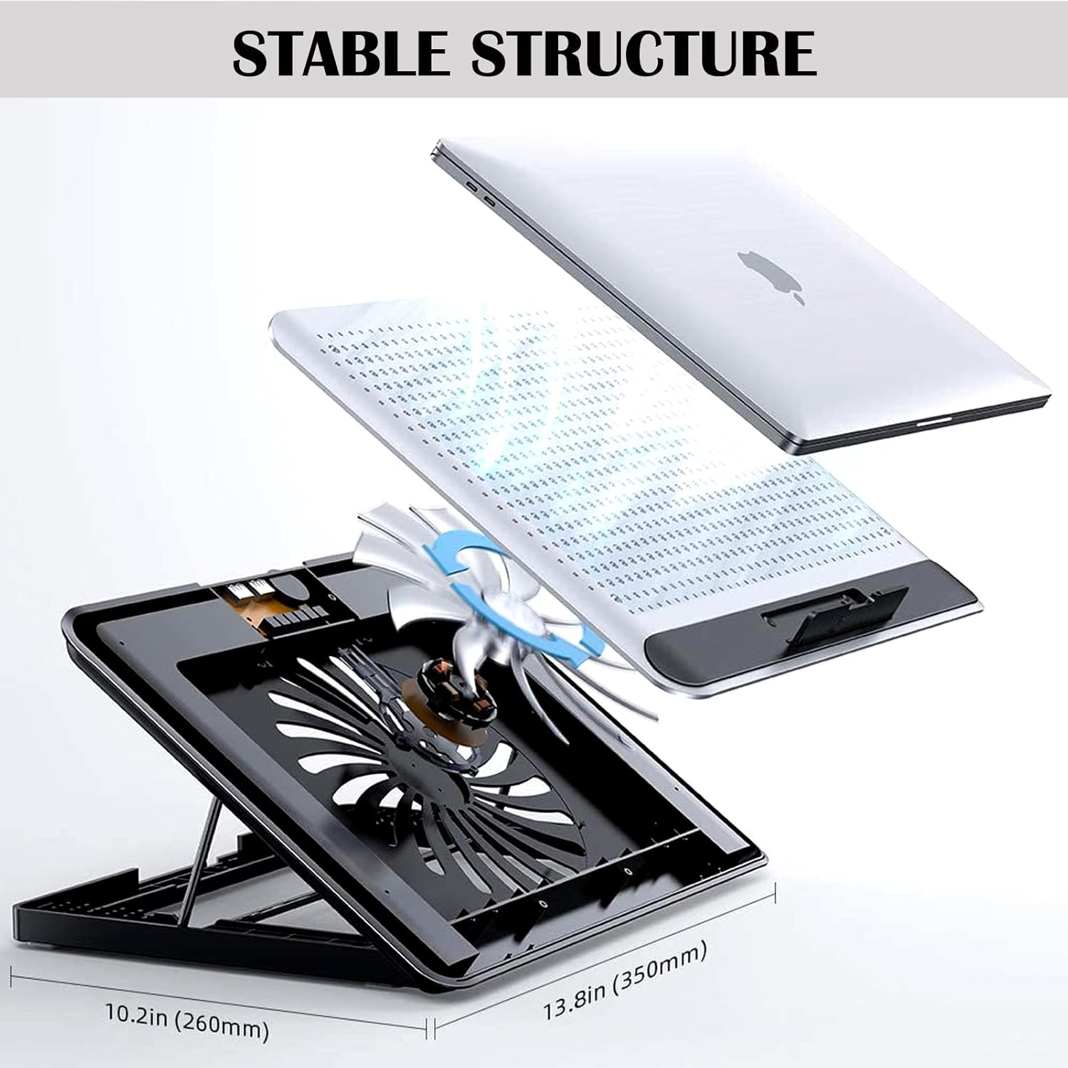 - 【ERGONOMIC LONG STANDS/POWER SWITCH/FAN SPEED ADJUSTED】5-Heights tilting stand (adjusted max 6inch. ) provides better viewing and typing angles, Also this definitely relieve body pain on your neck and back. Switch botton allows to turn off the fan and control fan speed. Besides,two USB ports can connect other USB devices like mouse/audio while the cooler is working.