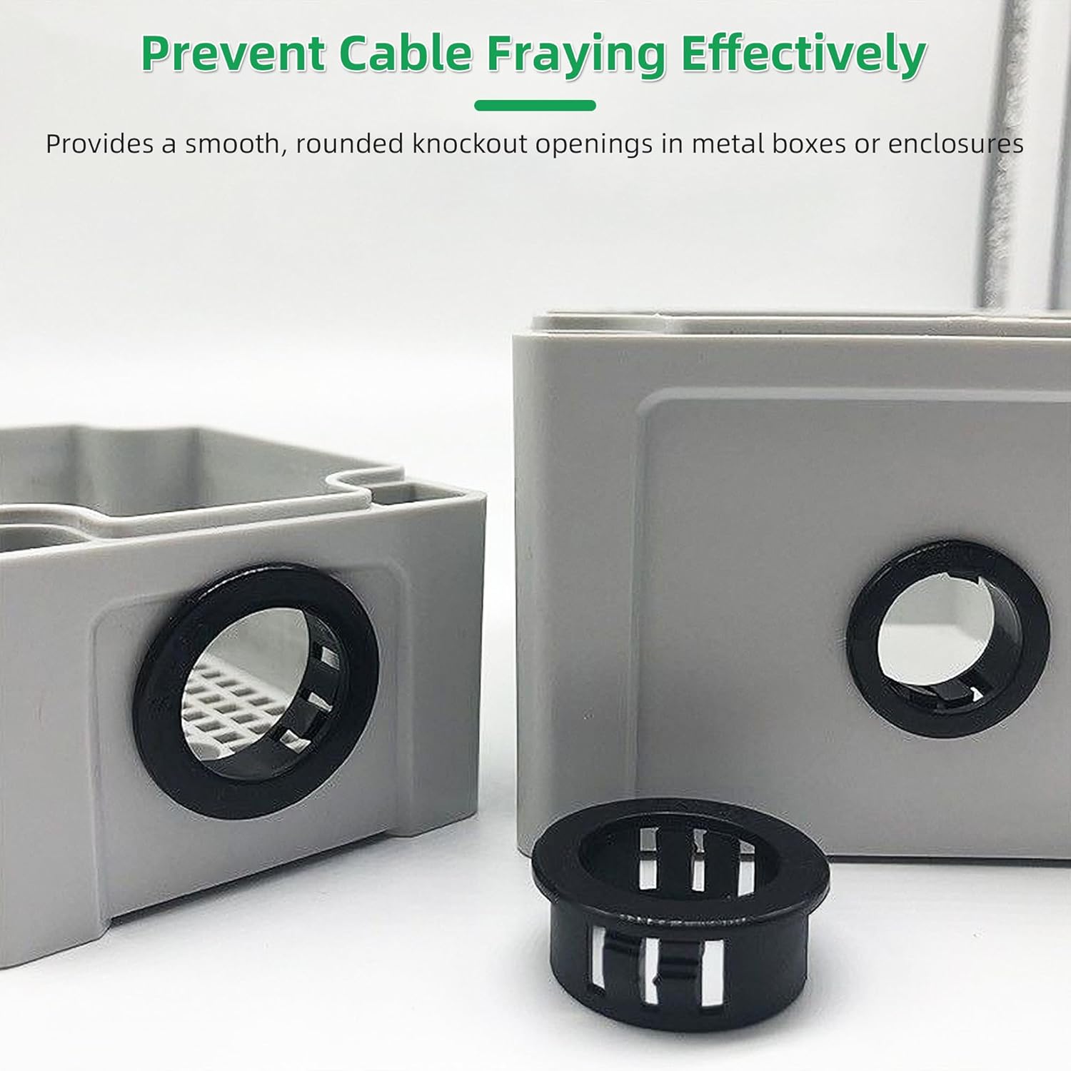 - GREAT FUNCTION: Our knockout insulating bushing converts raw edged knockout holes to smooth, neat, insulated holes and absorbs vibration and cushions; Our cable hose bushing grommet can also fix cables and prevent abrasion or scratches to improve safety