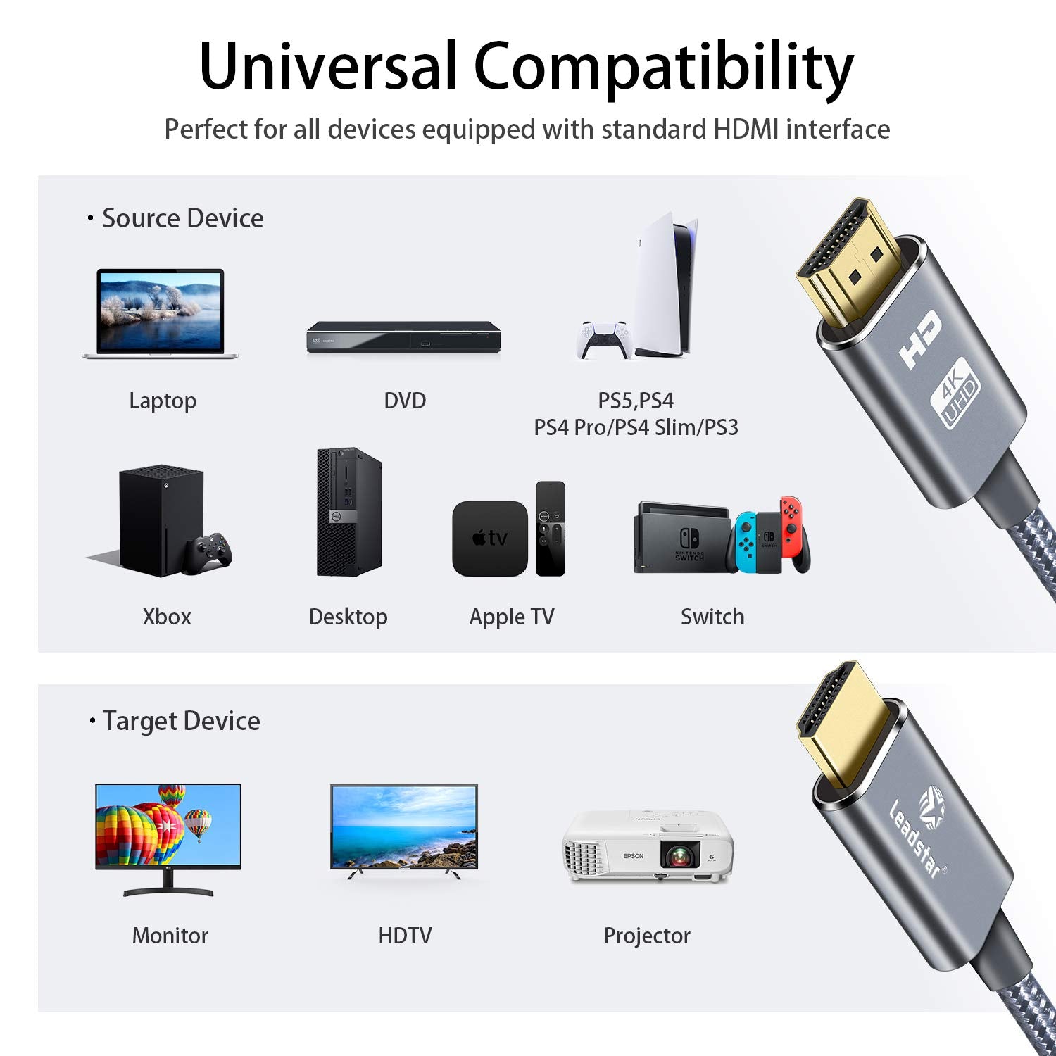 - 【Compatible HDMI Device】 Compatible with Xbox, Blu-ray players, Fire TV, Apple TV, PS4, PS5 and computers to TVs, displays, A/V receivers, Projector and more
