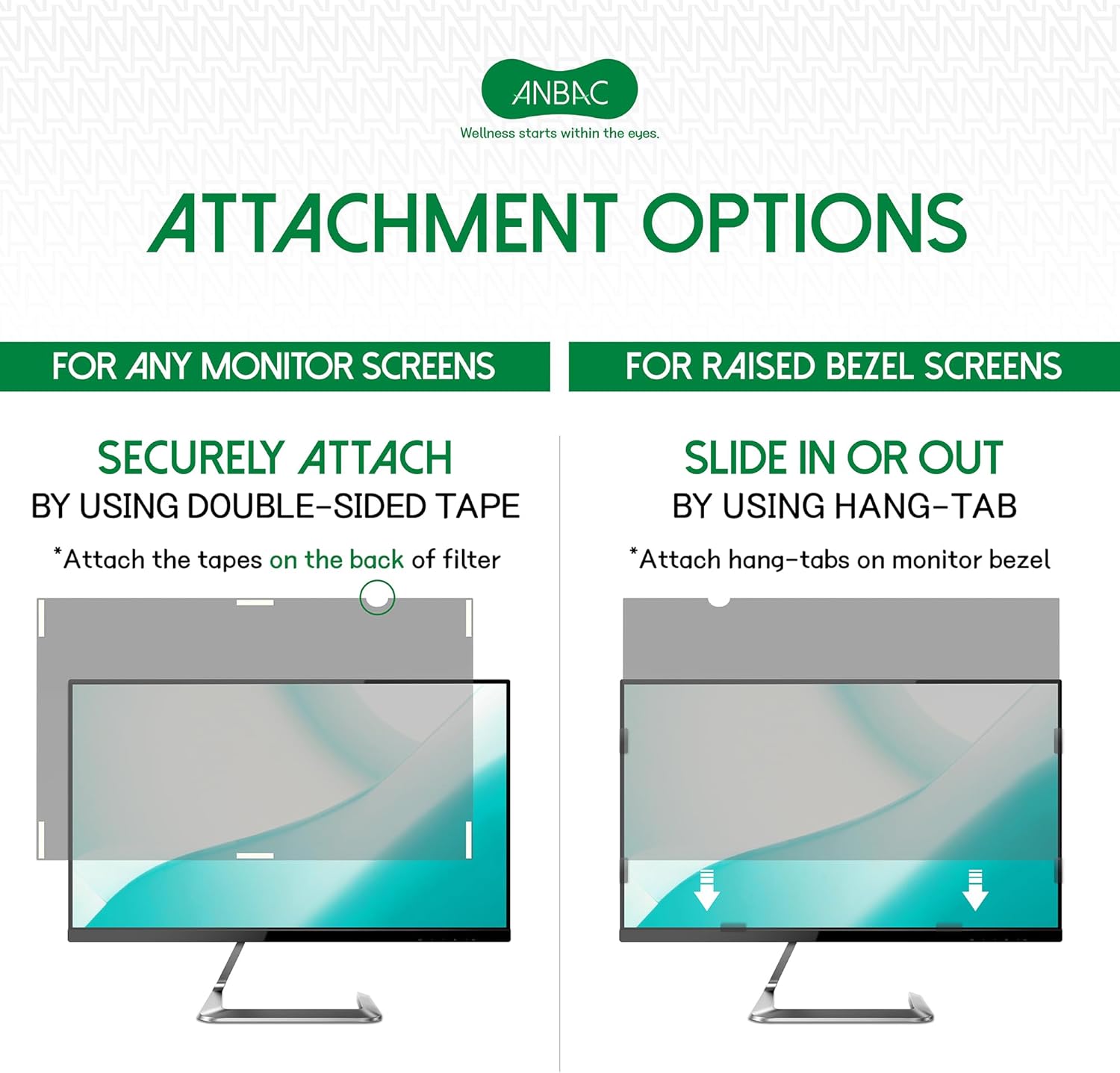 - ☘️ PACKAGE CONTENTS - Each package includes one ANBAC privacy screen filter, a quality microfiber cleaning cloth and a set of clear double sided tape & slide mount hang-tabs. Choose between two installation options. Option 1: Use the clear Double Sided Tape that securely adheres to any monitor screen. Option 2: Use the Slide Mount Hang-tabs that easily stick to the bezel on a laptop, allowing you to slide the privacy screen filter on and off as needed. *Option 2 is ONLY for raised bezel screens.