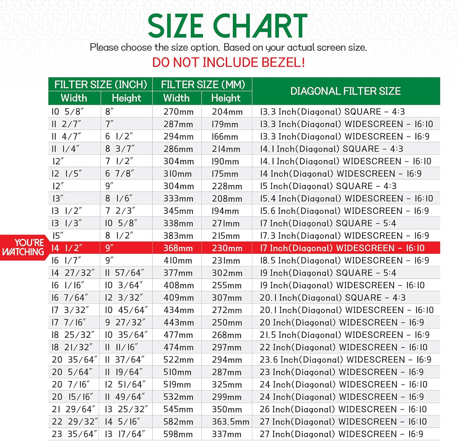- ☘️ FILTER DIMENSIONS - Width: 14 1/2" (368 mm), Height: 9" (230 mm), Diagonal: 17"W ANBAC ATTACHMENT TYPE PRIVACY SCREEN FILTER is compatible with all major brands such as HP, Dell, Samsung, Lenovo, LG, Acer, ASUS, ViewSonic, and the others. Please check your screen's width and height measurement in order to purchase the right filter for your screen size. (We advise that you DO NOT DECIDE your order only based on your screen’s diagonal size).