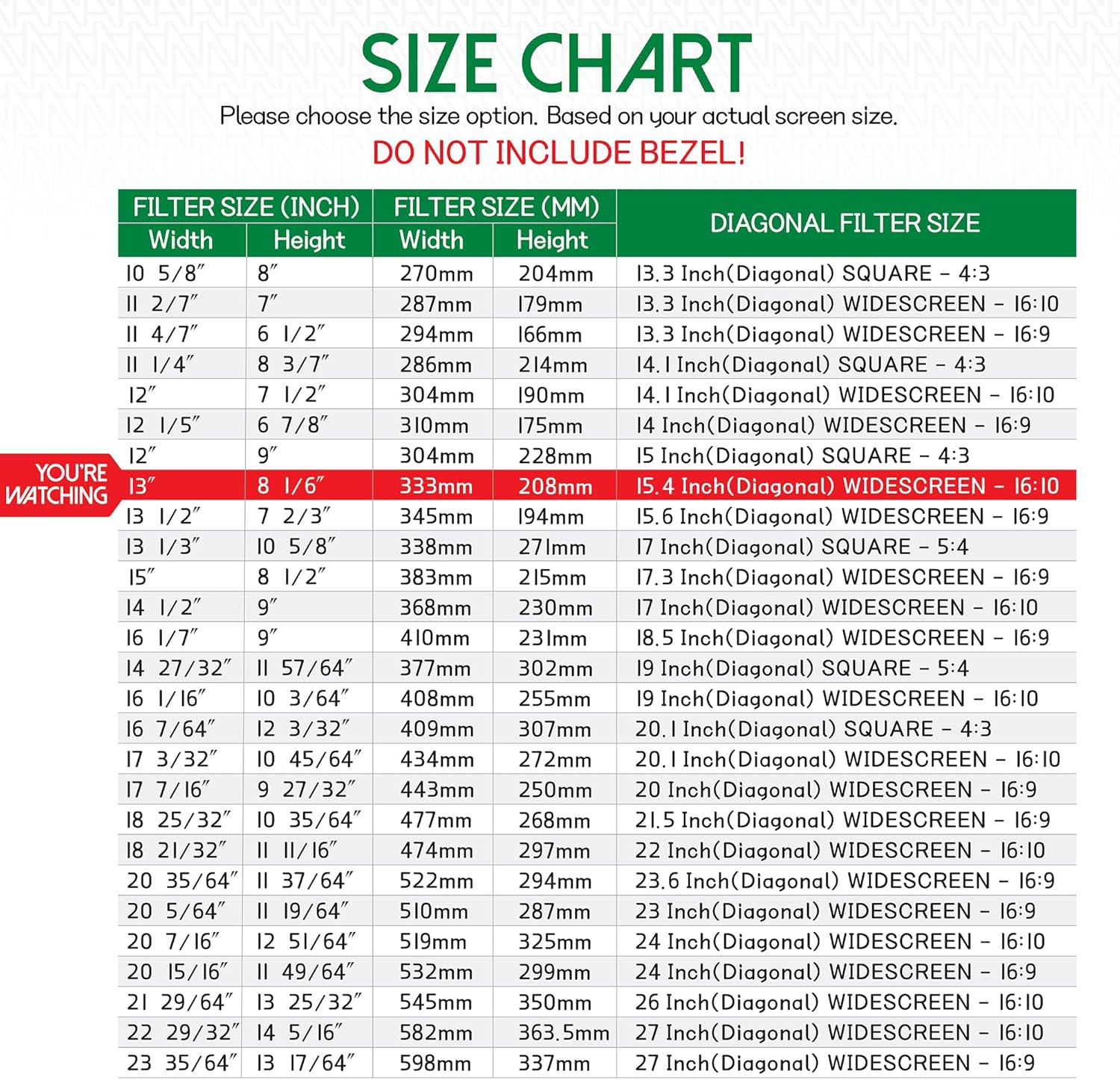 - ☘️ Filter Dimensions - Width: 13" (333 mm), Height: 8 1/6" (208 mm), Diagonal: 15.4"W ANBAC ATTACHMENT TYPE PRIVACY SCREEN FILTER is compatible with all major brands such as HP, Dell, Samsung, Lenovo, LG, Acer, ASUS, ViewSonic, and the others. Please check your screen's width and height measurement in order to purchase the right filter for your screen size. (We advise that you DO NOT DECIDE your order only based on your screen’s diagonal size).