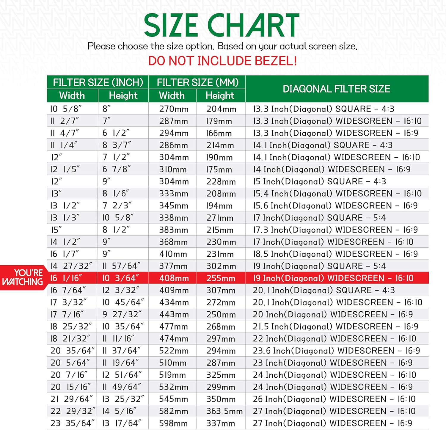 - ☘️ FILTER DIMENSIONS - Width: 16 1/16" (408 mm), Height: 10 3/64" (255 mm), Diagonal: 19"W ANBAC ATTACHMENT TYPE PRIVACY SCREEN FILTER is compatible with all major brands such as HP, Dell, Samsung, Lenovo, LG, Acer, ASUS, ViewSonic, and the others. Please check your screen's width and height measurement in order to purchase the right filter for your screen size. (We advise that you DO NOT DECIDE your order only based on your screen’s diagonal size).