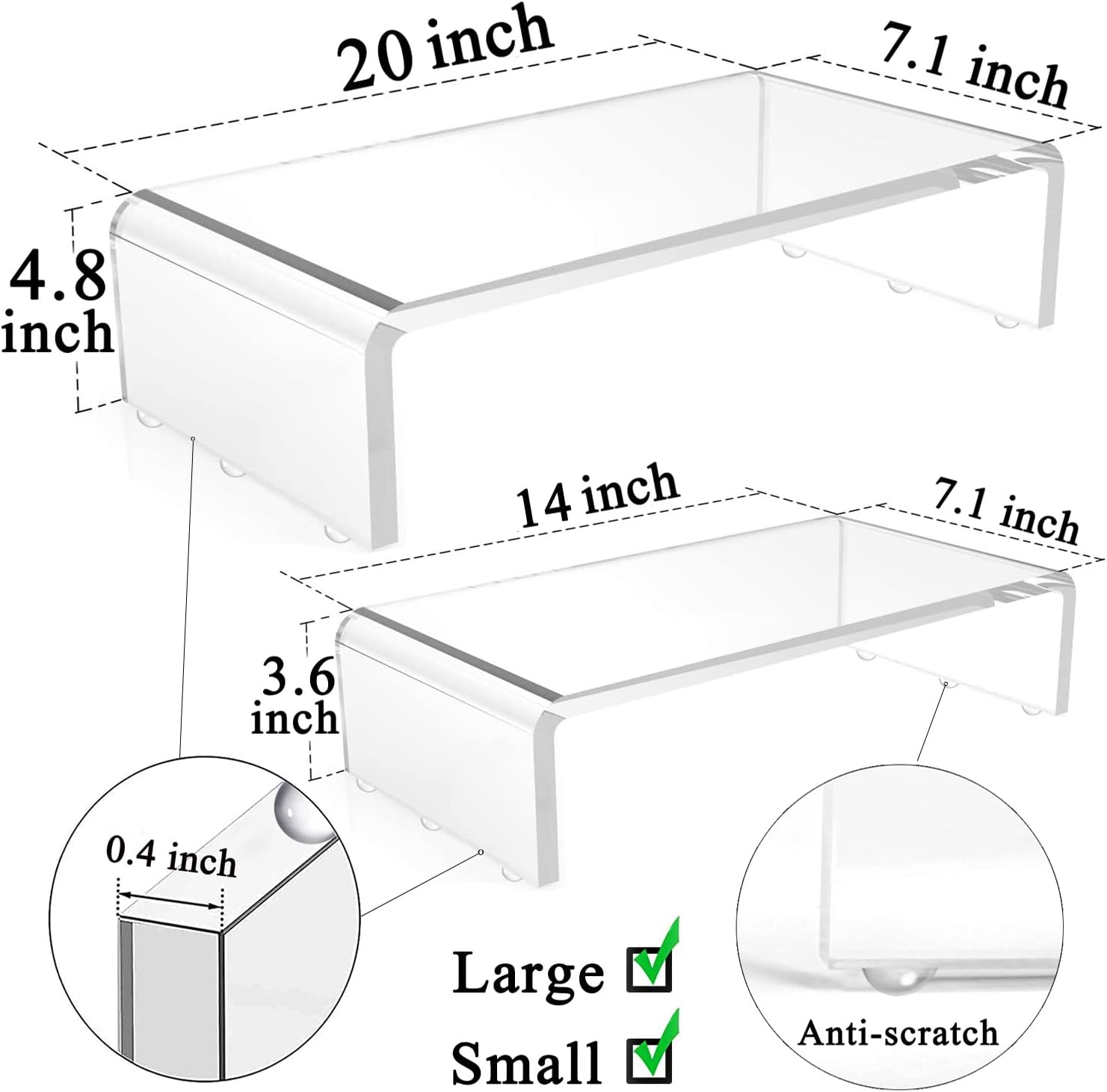 - CRYSTAL CLEAR & MULTI-FUNCTIONAL: acrylic construction with a polished finish creates a beautiful platform which blends seamlessly with any décor and set up in your home and office. The open design of the computer riser allows you to store books, keyboards and other essentials underneath the stand, saving your valuable desk space.