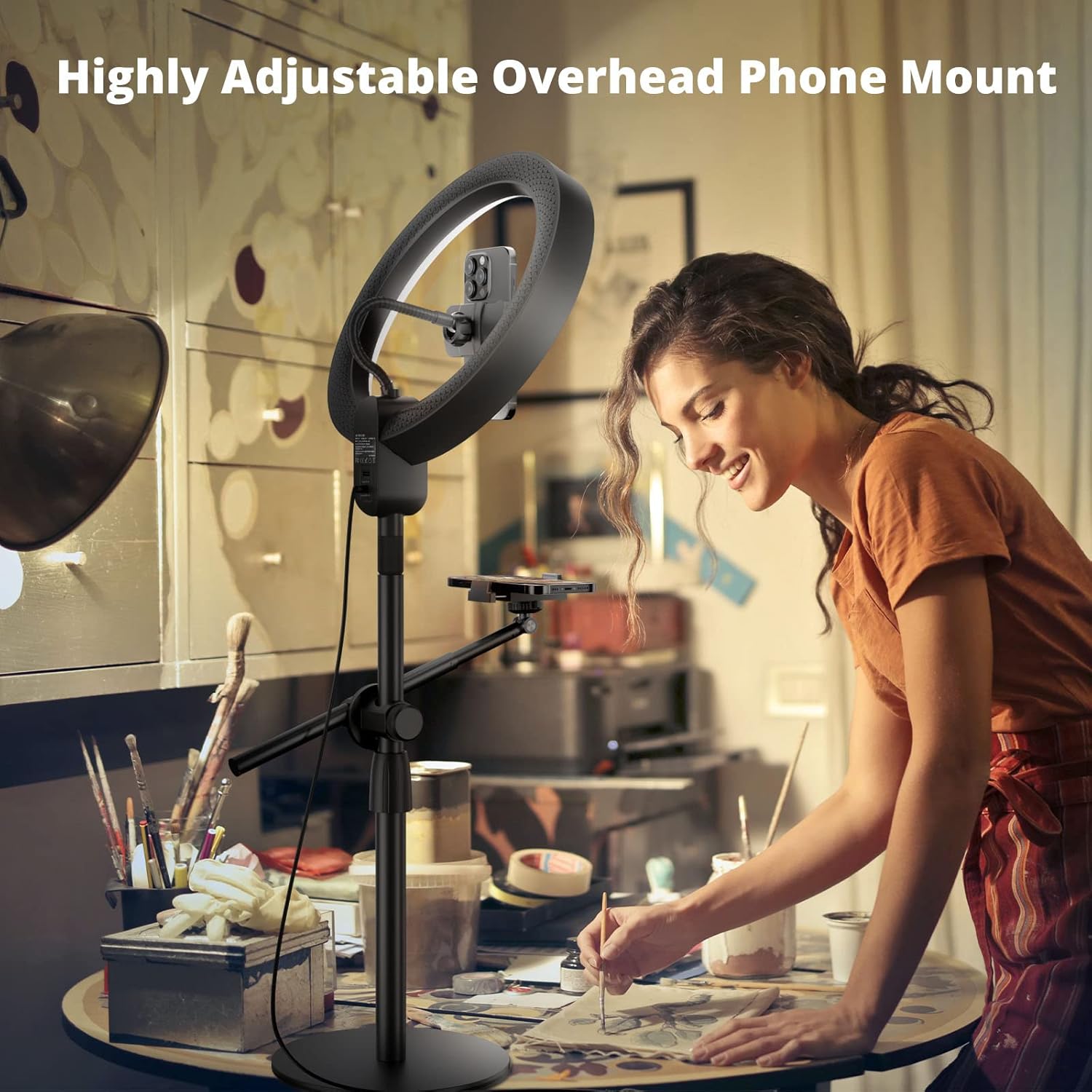 12" Ring Light with Stand and Phone Holder,Overhead Phone Stand,2 Phone Holders,2700-6500K,3 Color Modes,10 Brightness Levels,Remote Control,Adjustable,Live Stream,Tiktok/YouTube