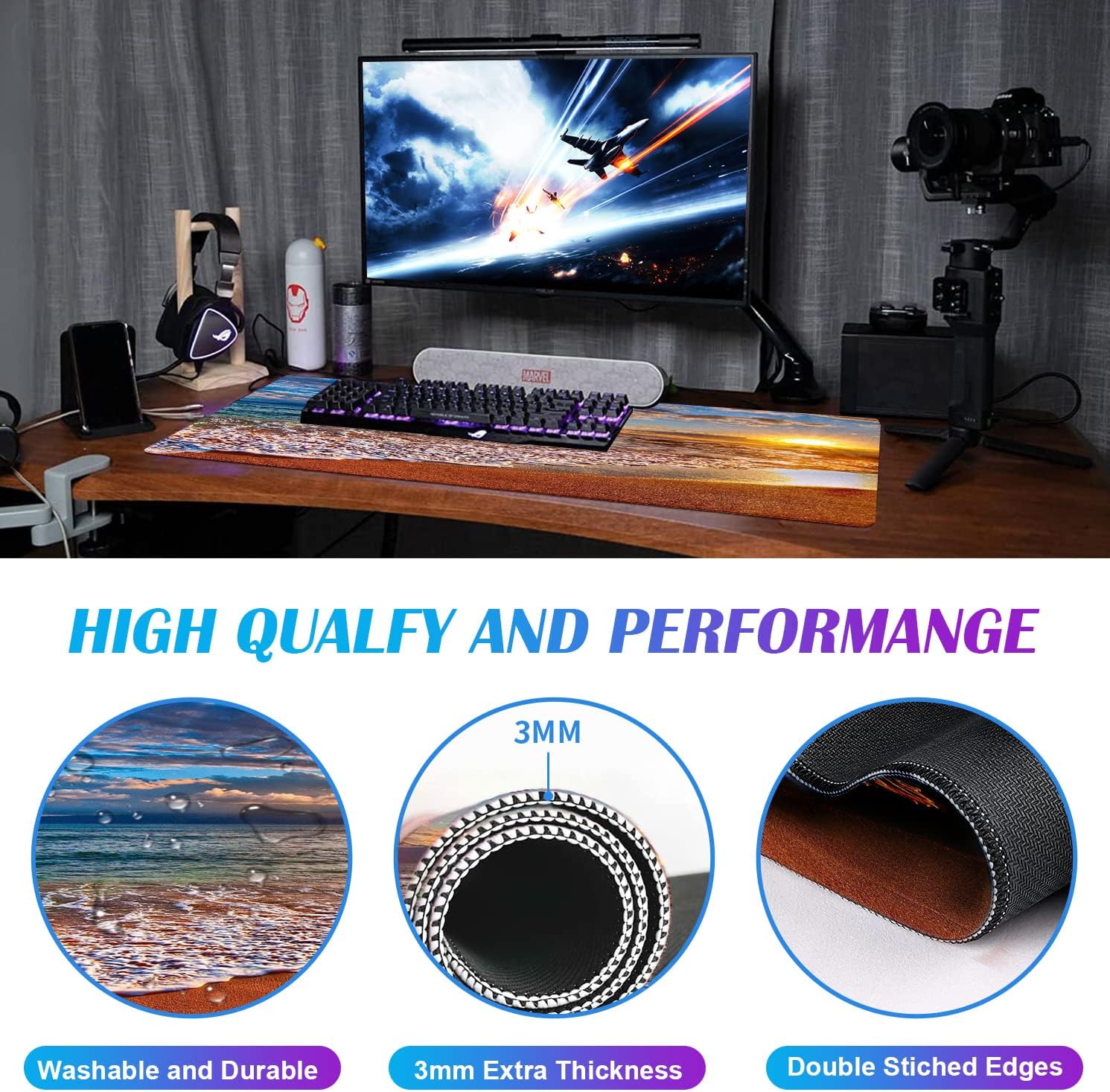 Large Extended Gaming Mouse Pad with Stitched Edges, Non-Slip Waterproof Rubber Base Mouse Pad for Office, Computer, Keyboard, Laptop and Home Desk Pad 35.4 x 15.7 x 0.12 Inch (Beach at Sunset)