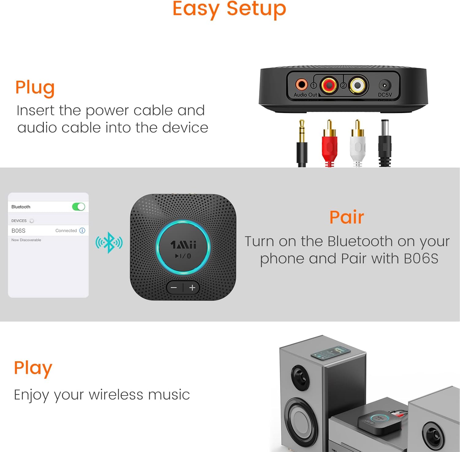 - 【PLUG N PLAY】Easy setup. Plug, pair and play. Plug 1Mii B06S Bluetooth audio adapter into computer speakers, home stereo systems or other speaker systems via the 3.5 mm or RCA cable, then pair with the Bluetooth audio devices such as smartphones or tablets. After that, you can enjoy the music. This product is a Bluetooth receiver only, NOT a transmitter.