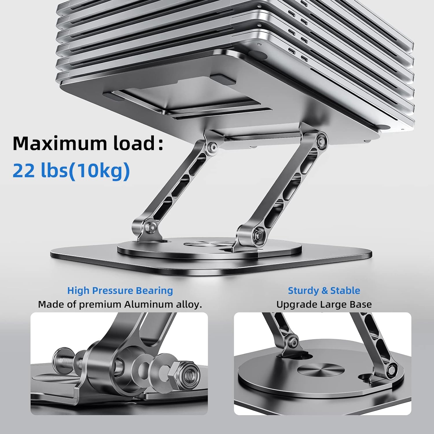- Stable:The office computer stand is made of high-quality thickened aluminum, and the larger turntable base can support 22 lbs (10kg) which are more stable and sturdier without worrying about any wobbling at all; The rubber on the holder hand is firmly stuck to protect your laptop from scratching and sliding off.