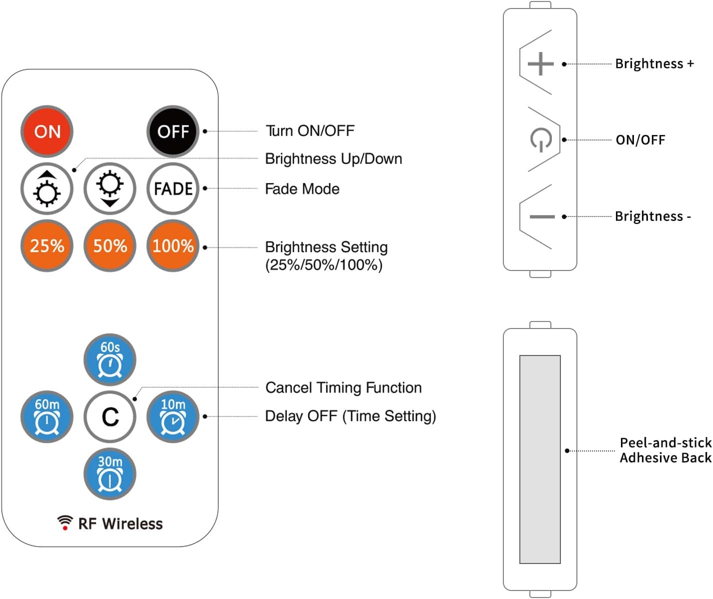 - [RF Remote Control Set] - 13 Keys design RF remote control for DC12V-24V single color LED light strip, 13keys remote control and 3keys controller with 5.5*2.1mm DC jack for easily using. The peel-and-stick adhesive of the controller is easy to fix in place.