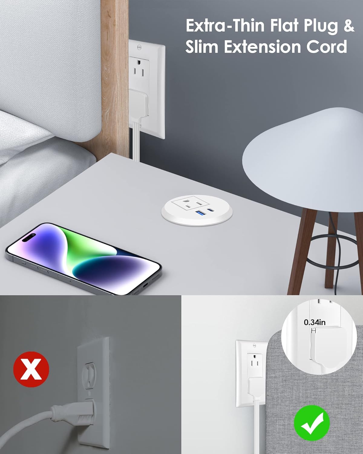 - Recessed Desk Grommet USB Outlet:with extra thin flat plug & 3mm slim extension cord. 0.34 inch ultra thin plug and 45 degree right angle design,Maximize space savings in your plug.125V/12A/1500W output.Multi plug outlet extender with 6ft cord.