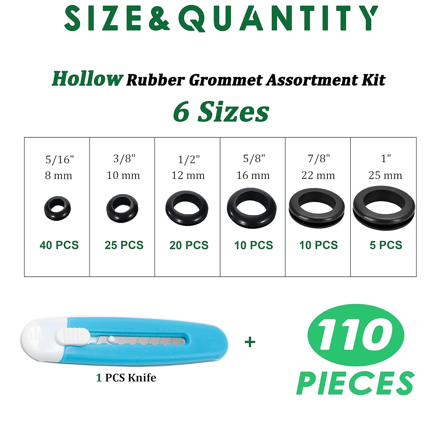 - Specification: 110 PCS rubber grommet kit in 6 common sizes to meet your various needs-5/16 in x 40 pcs, 3/8 in x 25 pcs, 1/2 in x 20pcs, 5/8 in x 10 pcs, 7/8 in x 10 pcs, 1 in x 5 pcs, all packaged in clear divided organizer case portable and easy to store
