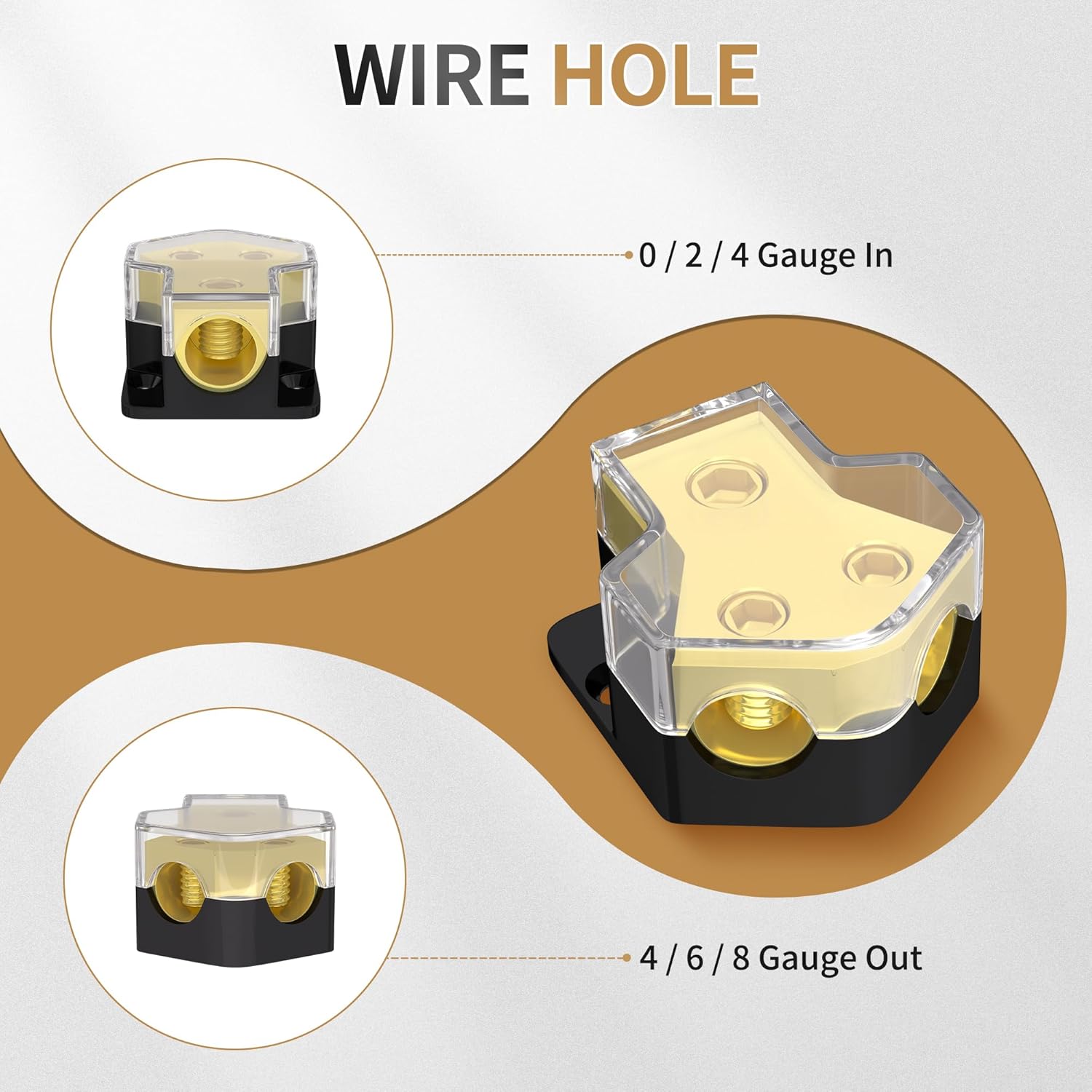 - Product Information: 12V Amp wire Power splitter block 2 way, 1 x Input hole, 2 x Output hole, 0/2/4 Gauge AWG In, 4/6/8 Gauge AWG Out