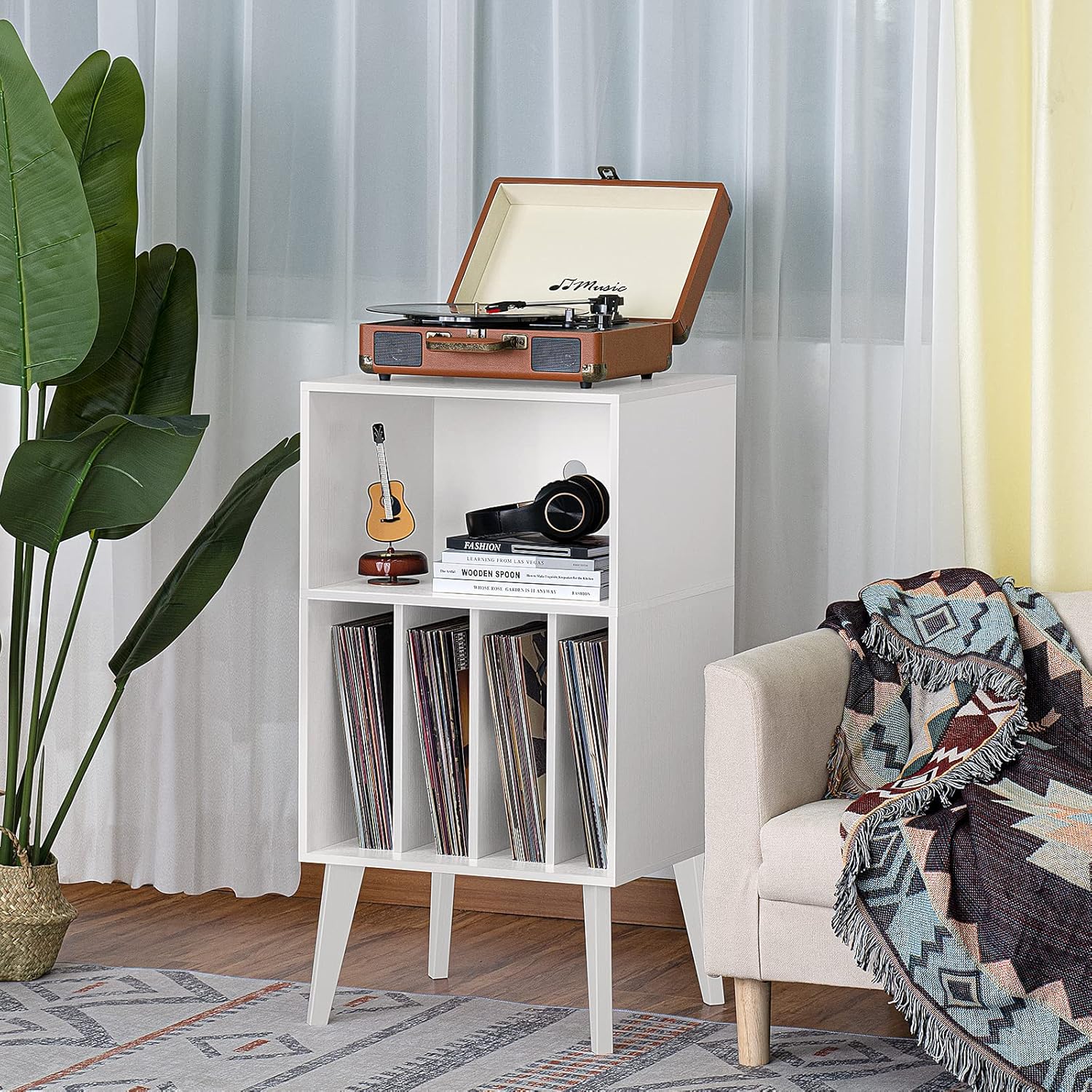- 【Sturdy Angled Solid Wood Legs】We choose high-quality solid wood materials to make the slanted table legs.The solid wood table legs make the structure of the record player storage more sturdy, while creating a superior texture.The inside of the bold slanting table legs is reinforced with special screws.The sturdy support structure of the record cabinet makes it fearless of the test of time, and it precipitates a unique and calm atmosphere as time passes by.