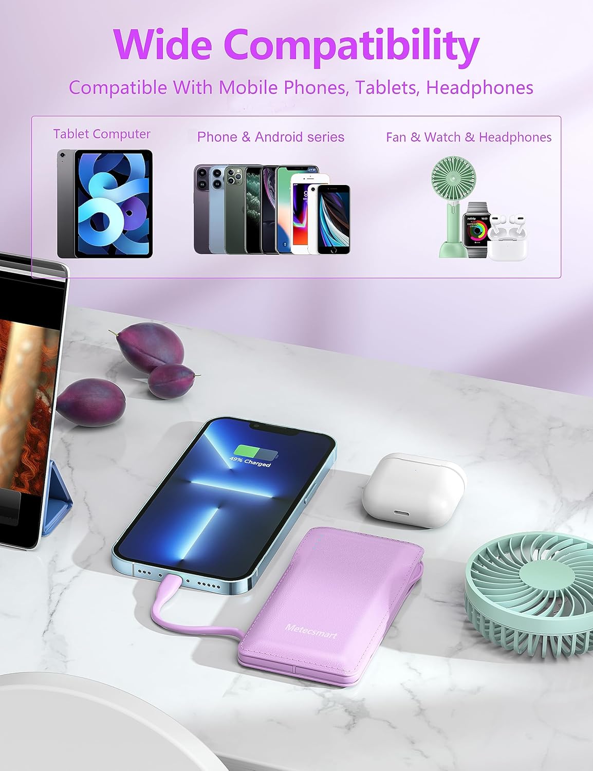 - So convinient! Using the built-in cables to charge, the portable battery charger is compatible with IOS smartphones and all USB-C devices and smart devices. For example, one built-in IOS cables compatible with iPhone 14/13/12/11/X/XS/8/7/6/5/5S series, iPad series, the other one built-in USB-C cable compatible with iPhone 15, iPhone 15 Plus, iPhone 15 Pro, iPhone 15 Pro Max, Samsung S23,S22,S21,S20 series and other cell phones