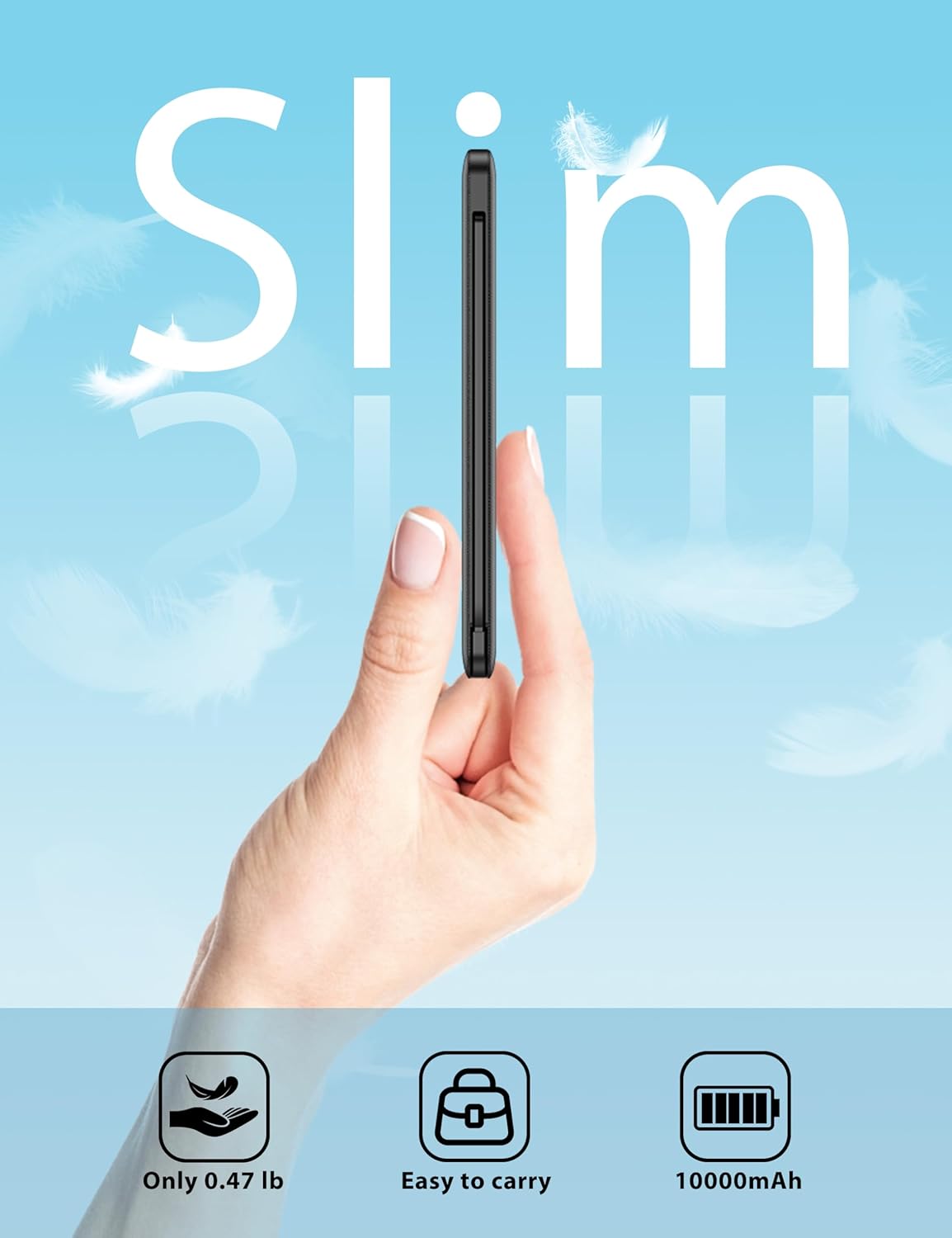 - High Capacity: Contains 10000mAh of power. Enough to provide over 2 entire replacement charge for iPhone 16, for iPhone 15 and Samsung Galaxy S24. 10000mAh can meet your daily electricity demand. And its body is slim, 5.59*2.75*0.57inch like a little phone that you can carry it in your handbag. It will be your most important partner daily. And when you are traveling or on a business trip that will be helpful