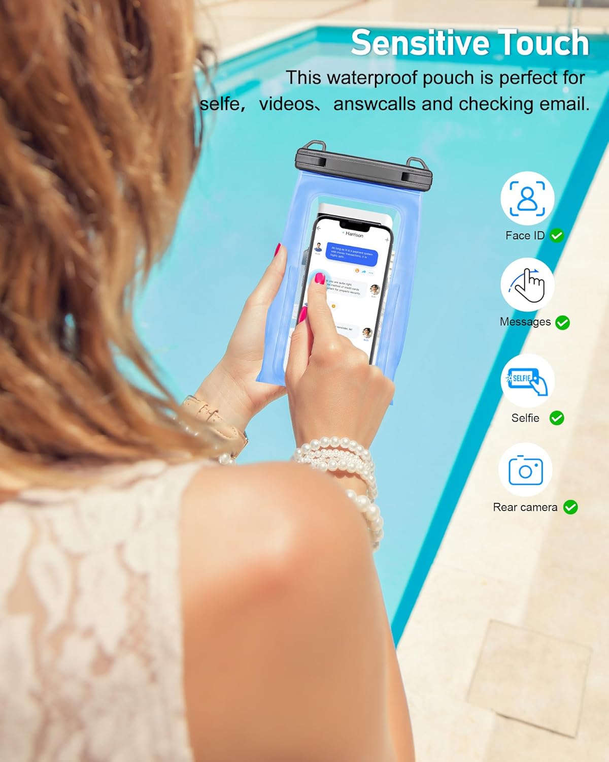 - Sensitive Touch Screen - The waterproof pouch is made of premium soft touch PVC materials, with excellent touch screen performance, allowing you to messages, make a call, watch videos, face recognition, and take selfies without taking out your phone of the pouch and surpport take photo by rear camera(Do not to let other stuff block the phone camera)