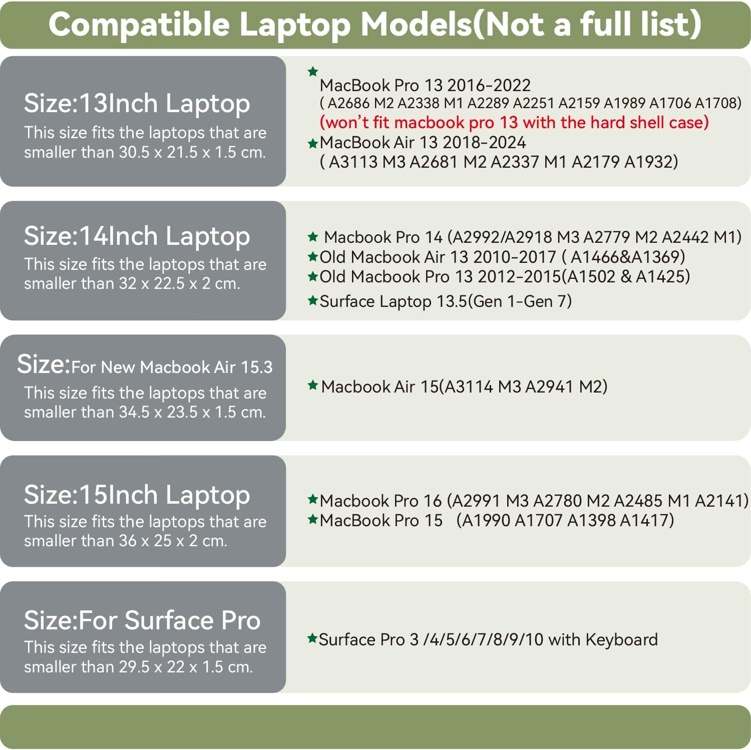 - Perfect Size: Our laptop sleeve is compatible with 2023-2024 New Macbook Air 15( A3114 A2941).Other laptops that are smaller than these dimensions-34.5x23.5x1.5 cm.If your laptops are too small than the above dimensions,then the sleeve will be a loose fit.If one of your laptop's width,depth or height is larger ,then pls consider the next size