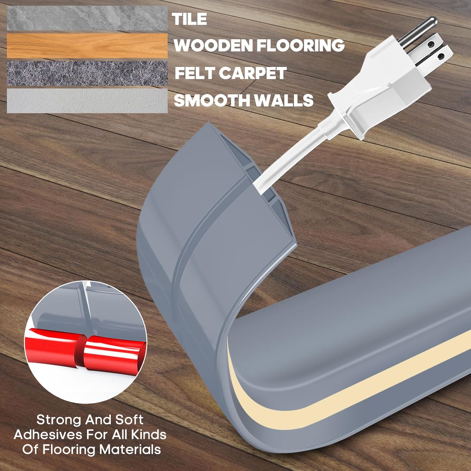 - [Self-Adhesive] Floor Cord Cover by Chudeng is good for any flooring because of the heavy duty adhesive tape that can be used on any surfaces. It can effectively maintain good adhesion. Put the extension cord cover on the floor and press it. The cord cover will stick firmly to the floor. It even can protect the cable from damaging from the rolling chair.