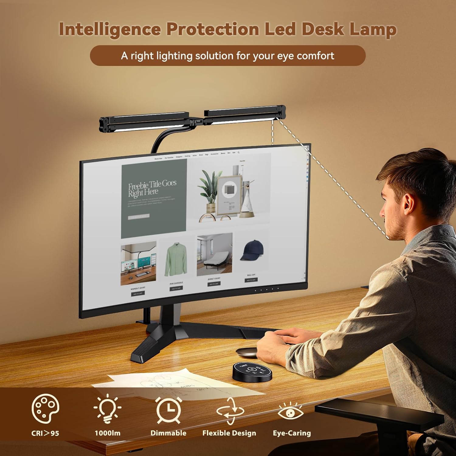 Led Desk Lamps for Home Office - Eye Caring Architect Lamp with Clamp, Double Head Computer Monitor Gooseneck Desk Light with Remote Control: 24W Flexible Dimmable Desktop Table Lamp