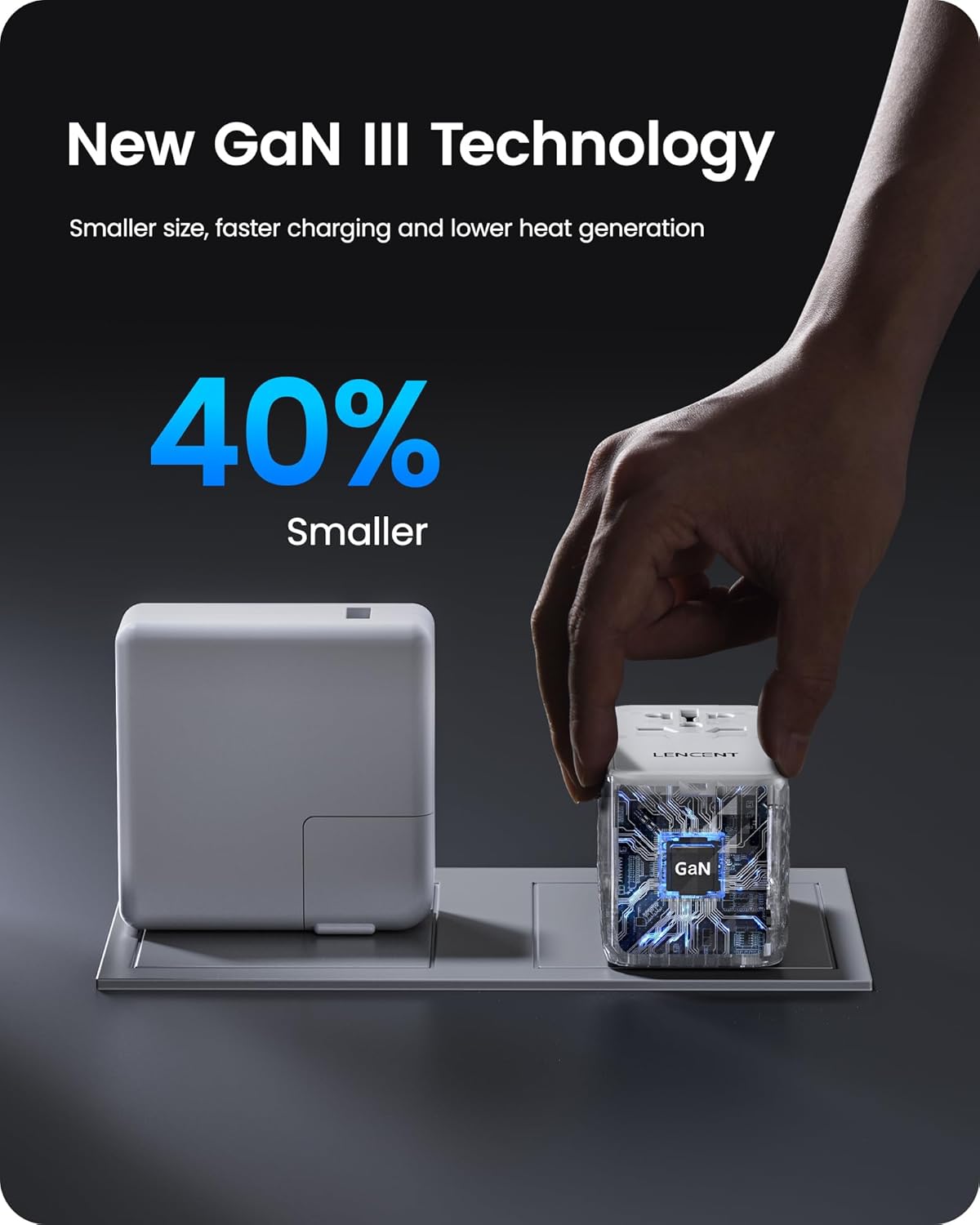 - Advanced GaN III Technology: Featuring GaN III technology, this worldwide travel adapter is compact, efficient, and generates less heat. It outperforms traditional chargers with faster charging, lower temperatures, and a built-in multi-protection system for safer, high-performance charging