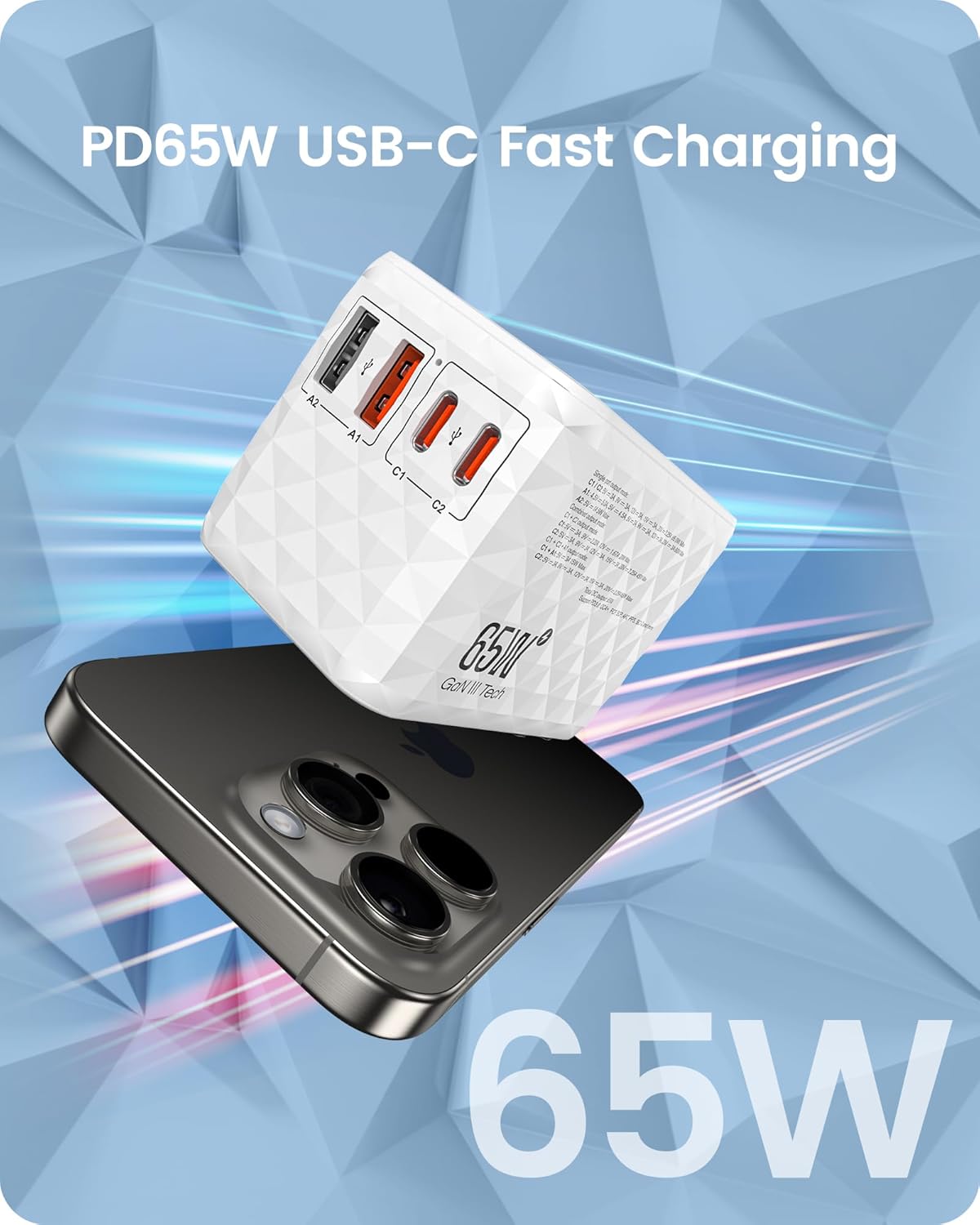 - 65W USB-C Fast Charging: This 65W travel adapter fast charges phones, tablets, and USB-C notebooks, with the USB-C port delivering up to 65W. It fully charges a MacBook Air M2 in under 2 hours and an iPhone 14 Pro to 78% in 30 minutes. Smart charging technology ensures optimized power output for extended battery health and a superior charging experience