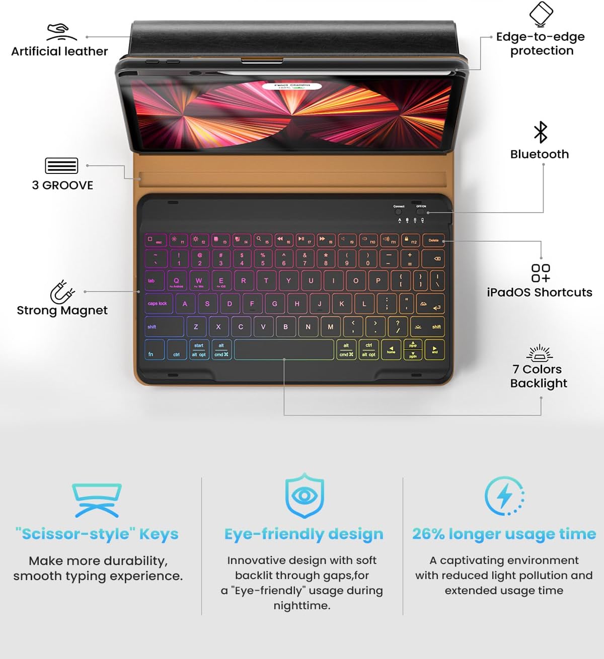 Leather Keyboard Case for iPad Air 5th 4th Generation 10.9 inch Pro 11 1st/2nd/3rd/4th, 7 Color Backlight BT Keyboard Folio with Pencil Holder 2022 2021 2020 2018 (Black