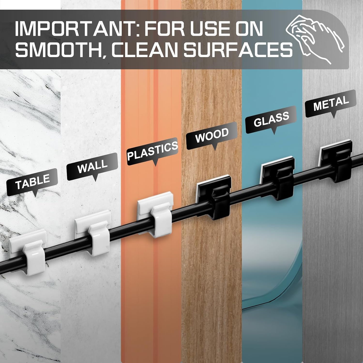 - Note Before Use: Clean the surfaces before attaching the wire clips to ensure that the mounting surfaces are free of dirt, dust, grease and wax. Stick it on and press firmly for 10 seconds, and use them after 2 hours for maximum adhesion.