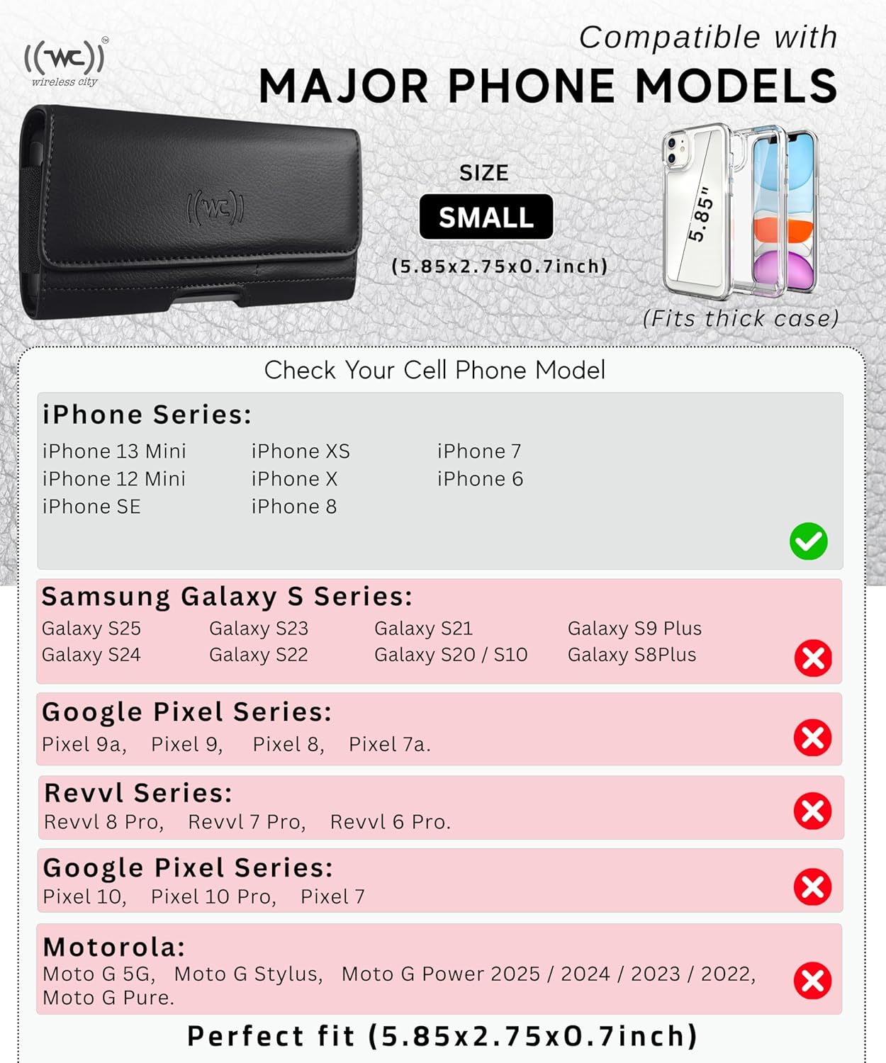 - ๐๐ง๐ข๐ฏ๐๐ซ๐ฌ๐๐ฅ ๐๐จ๐ฆ๐ฉ๐๐ญ๐ข๐๐ข๐ฅ๐ข๐ญ๐ฒ โ ๐ ๐ข๐ญ๐ฌ ๐๐๐ญ๐๐ฌ๐ญ ๐๐จ๐๐๐ฅ๐ฌ: This Cell Phone Holder for belt, Fits iPhone 13/12 Mini, SE, Xs / X, 8, 6s, Fits slim Vertical Phone Pouch & heavy-duty cases up to (5.8"W x 3"H) screen (see size chart).