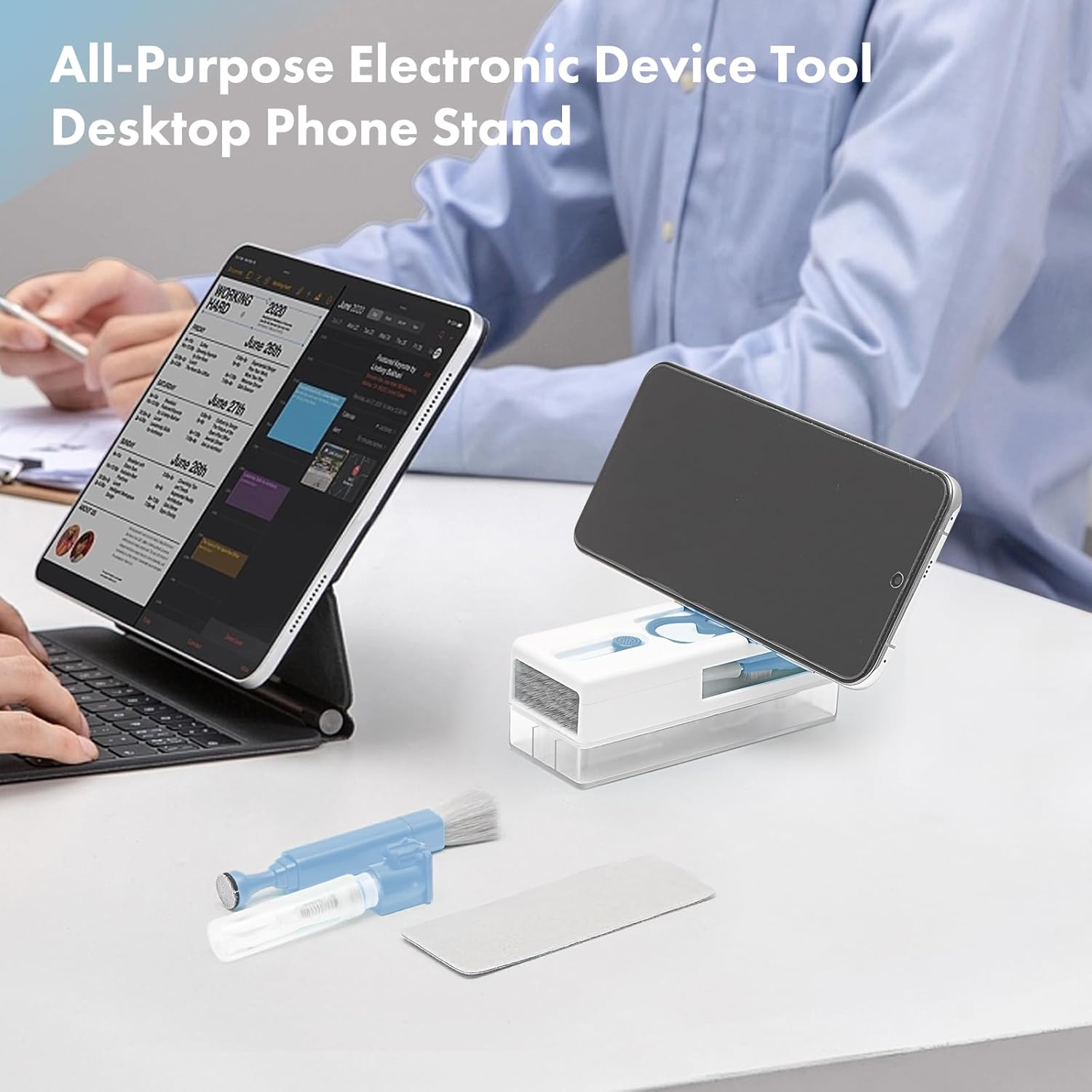 - π»γπΎπππ πππππ πππΌππΏ οΌππΌππππ πΎπππΌππππ πππγ: With our latest keyboard cleaner not only will your tech devices look like new, but you'll also have an extra cell phone stand for your desk! Our comprehensive computer cleaning kit includes a range of tools Like memory foam stick, card extractor, clean the nib, long brush, key puller, phone holder, hide brush, 3ml keyboard cleaner air spray(maintain a clean and hygienic phone), 5* lens cleaning cloth and 2* wash flannel