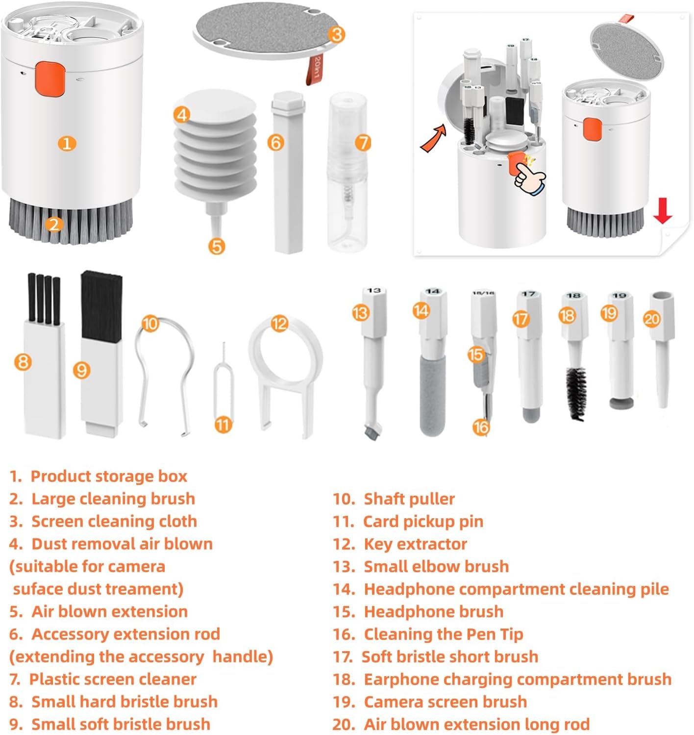 - ๐ฟใ20-in-1 Keyboard Screen Cleaning Kitใ: The computer cleaning kit includes retractable large brush, Airpod crevice cleaning pen, mini brush and flocked sponge brush, headphone case cleaning brush, charging port brush and camera screen brush, etc. (all of these brushes have extension rods for easier use). The cleaning kit also includes a screen cleaning cloth and spray bottle, keycap extractor, shaft extractor, 2 extension poles, blower, dual brushes (hard and soft bristle), and a card removal pin.