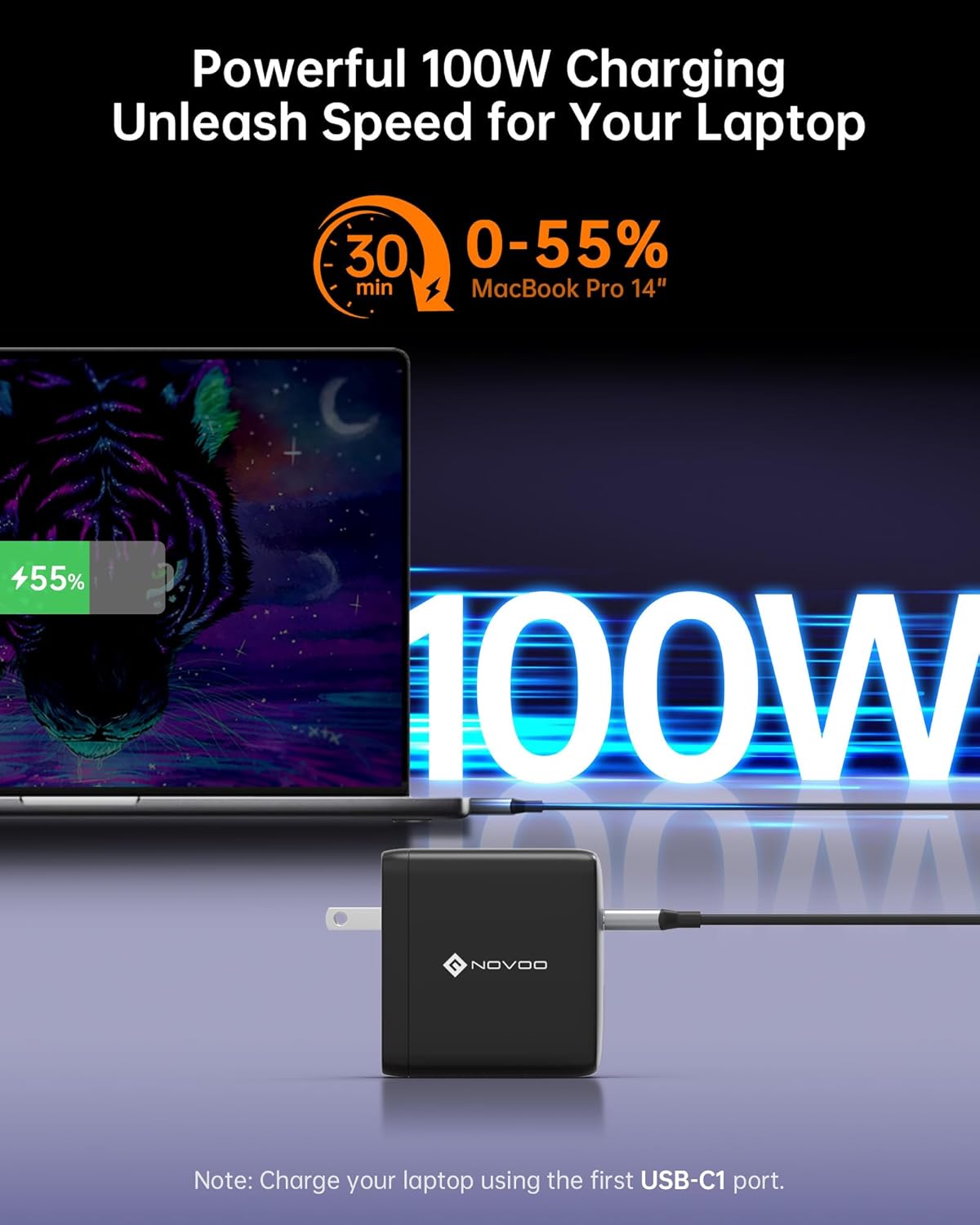 - 【MacBook Pro Hyper Fast Charger】NOVOO Multi-function USB wall charger power supplies an input voltage of 100-240 volts. The charging station includes 2 USB-C ports and 1 USB-A ports to charge multiple devices, such as laptops, cellular phones, tablets, headphones, smartwatches, Swtich etc. USB C single port pumps 100W to a MacBook Pro 14", charge to 55% in 30 minutes.