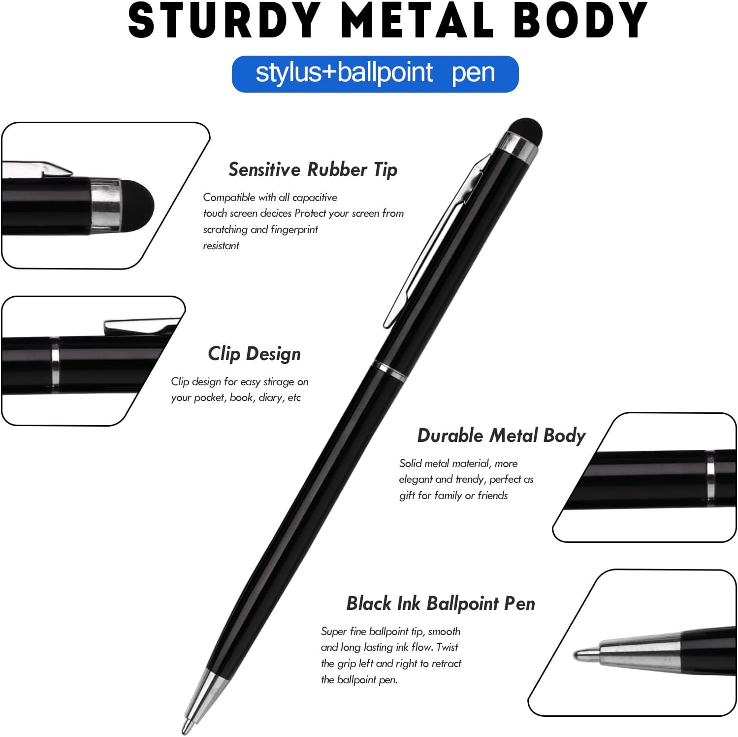 - Muti-use and Convenient: 2 in 1 Design Stylus Pens, Slim and Lightweight,One side contains sensitive stylus for touch screens,One side the black ink ballpoint pen on the other side for convenient writing,Smooth and long lasting ink flow