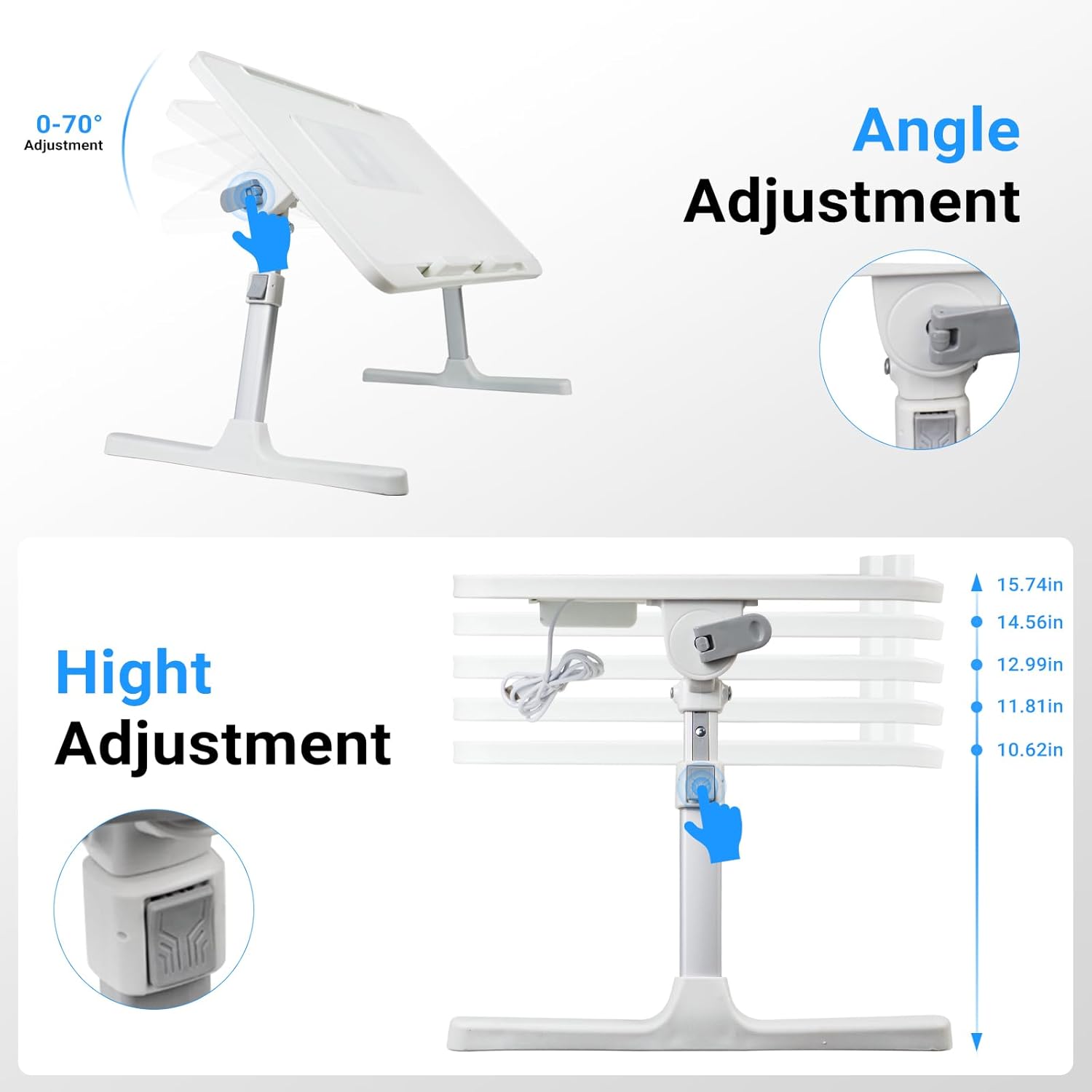 Laptop Lap Desk with Cooling Fan - Adjustable with Light, USB, Storage Drawer - Folding Bed Desk,23.62"*15.74",White
