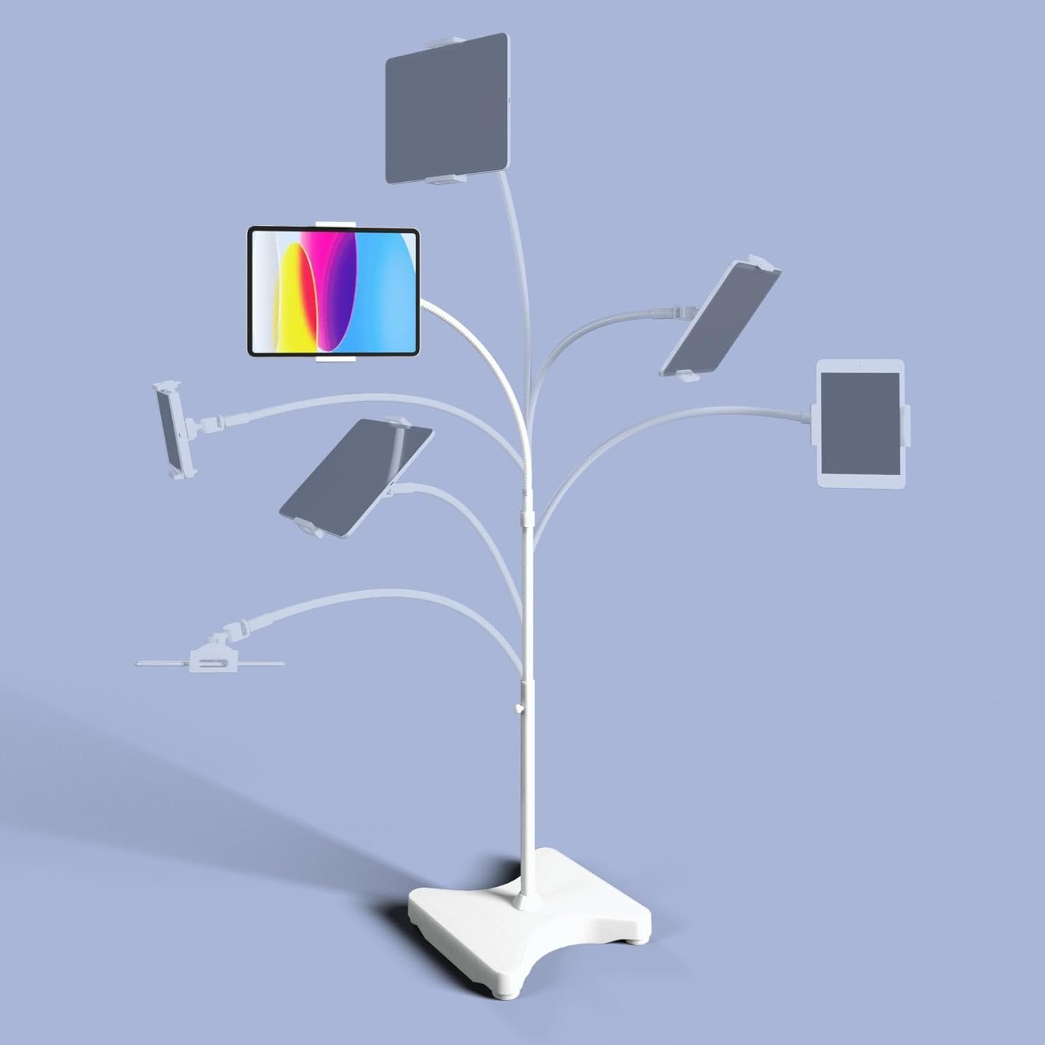 LEVO Adjustable Height Floor Stand for Tablet & Phone - Gooseneck Holder Mount with Stable Base - Compatible with All Cell Phones & Tablets (4-13 inch) - White