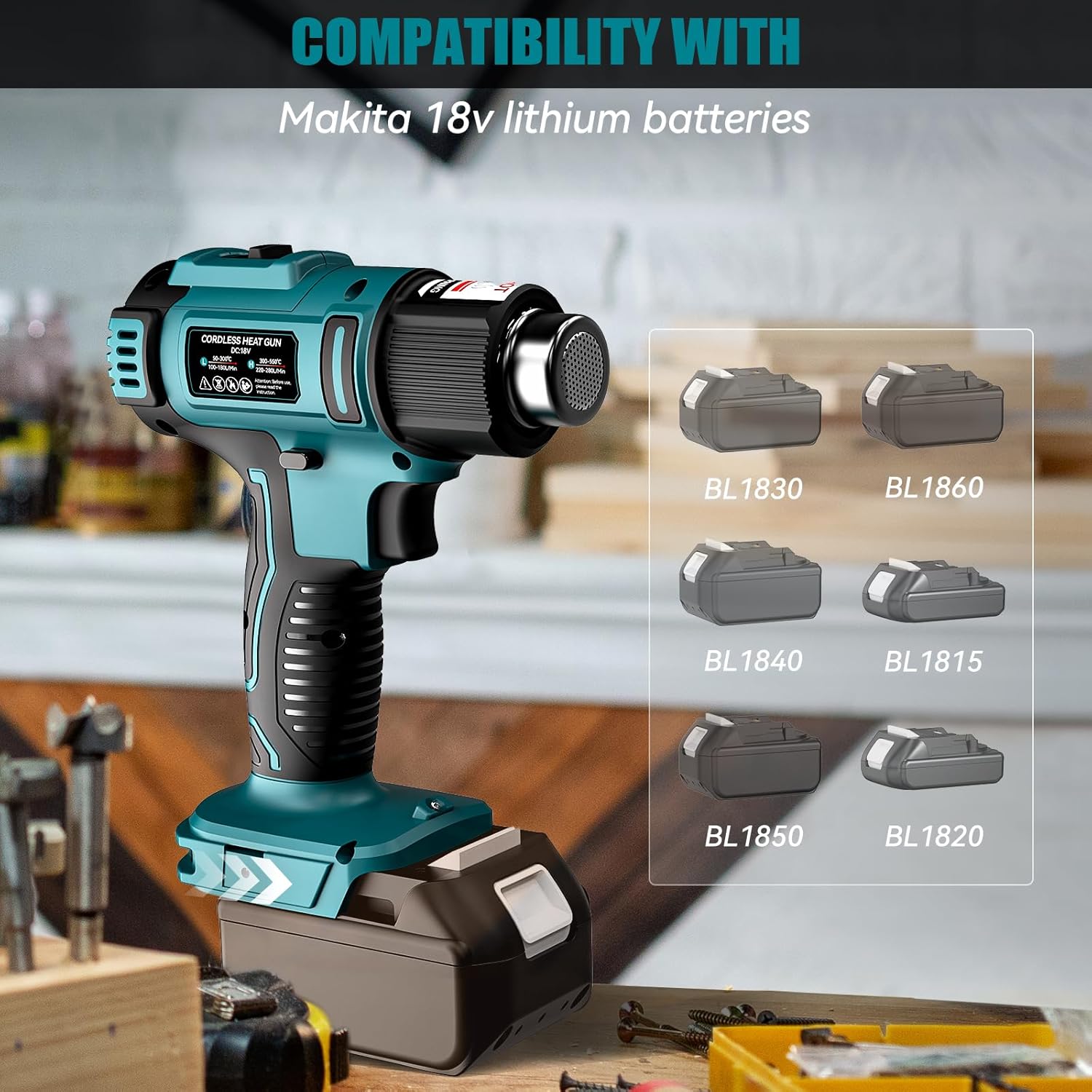- 【Battery Powered】——LIVOWALNY cordless heat gun heat gun is compatible for Makita 18v lithium-ion batteries BL1860 BL1850 BL1840 BL1830 BL1815 and more. Easy to use even when there is no power supply outdoors, as long as you bring batteries. And you no longer need to be tethered to an outlet or struggle with tangled cords, making it easy to work in tight spaces, on job sites, or outdoors. Warm tip: this heat gun wireless does not include batteries.