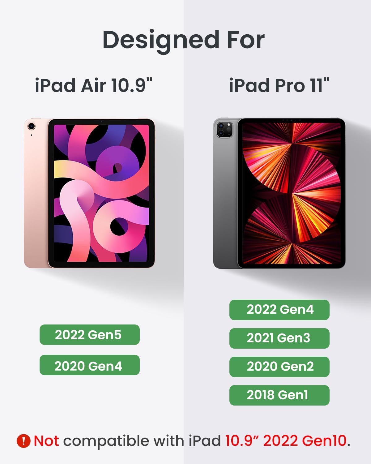 - Compatible with iPad Air 5 (2022) 10.9"/Air4 (2020) 10.9"/Pro 11" (2022/2021/2020/2018),including model NO. A2591/A2589/A2588-A2325/A2316/A2324/A2072-A2435/A2761/A2762/A2759-A2377/A2301/A2459/A2460-A2228/A2068/A2230/A2231-A1980/A1934/A1979/A2013. Please kindly check the back of your devices before purchasing