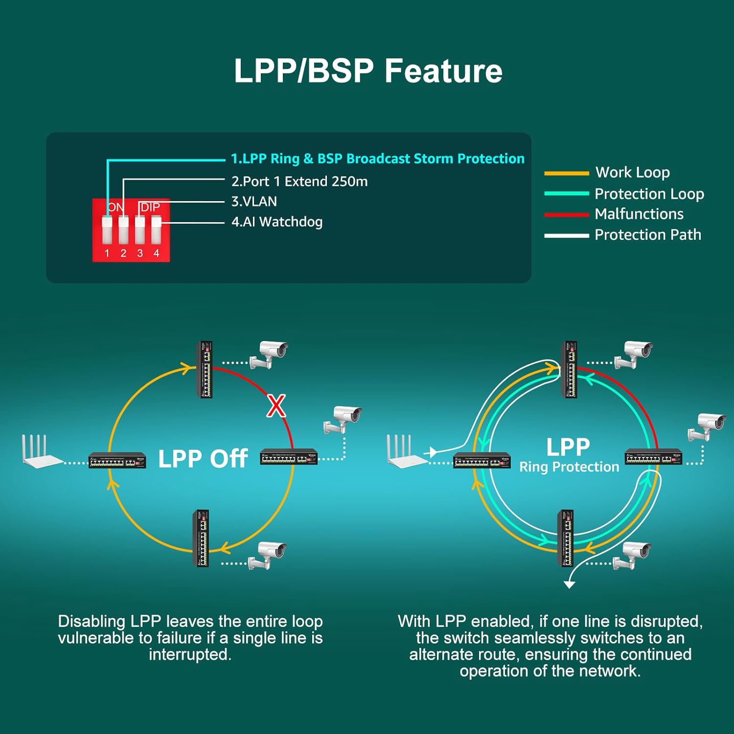 - ๐AI Watchdog Mode - This enhanced 10-Port 1000Mbps ethernet PoE switch features AI Watchdog Mode. This advanced functionality automatically detects and rectifies port issues, guaranteeing uninterrupted power delivery to all connected devices. Elevate your network's security and reliability with seamless operation, ensuring unparalleled performance for your infrastructure.
