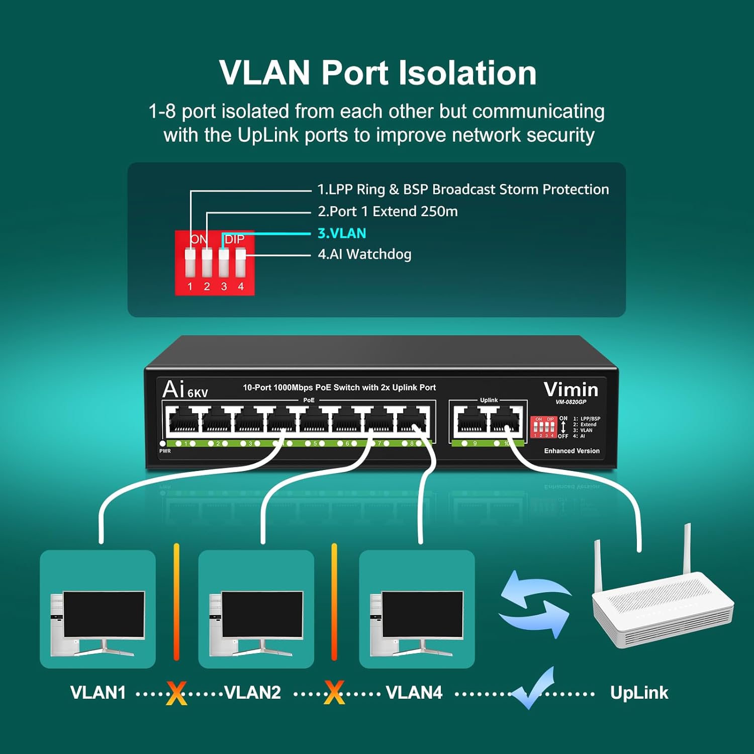 - ๐One-Key VLAN & Extend 250m - Our 10-port PoE network switch features an advanced One-Key VLAN mode. By isolating the 1-8 ports from each other while maintaining communication with the uplink ports, this mode improves network security and optimizes bandwidth utilization. Additionally, this switch with an extended distance of up to 250m. supports transmission speeds in 10Mbps.