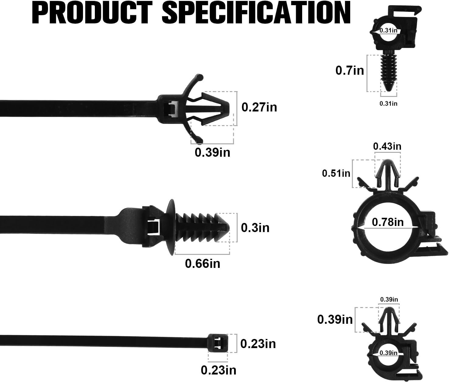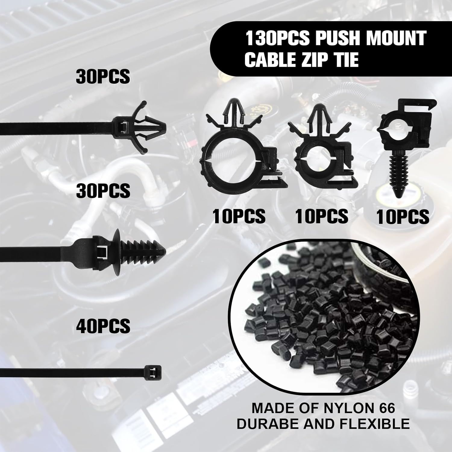 - Versatile Styles Push Mount Cable Zip Tie: Package Includes 130 pieces wires harness clips of 6 different styles of push-in retainer clips tailored for different vehicle models and wire harness sizes and meet your diverse wire management needs with cable zipper ties.