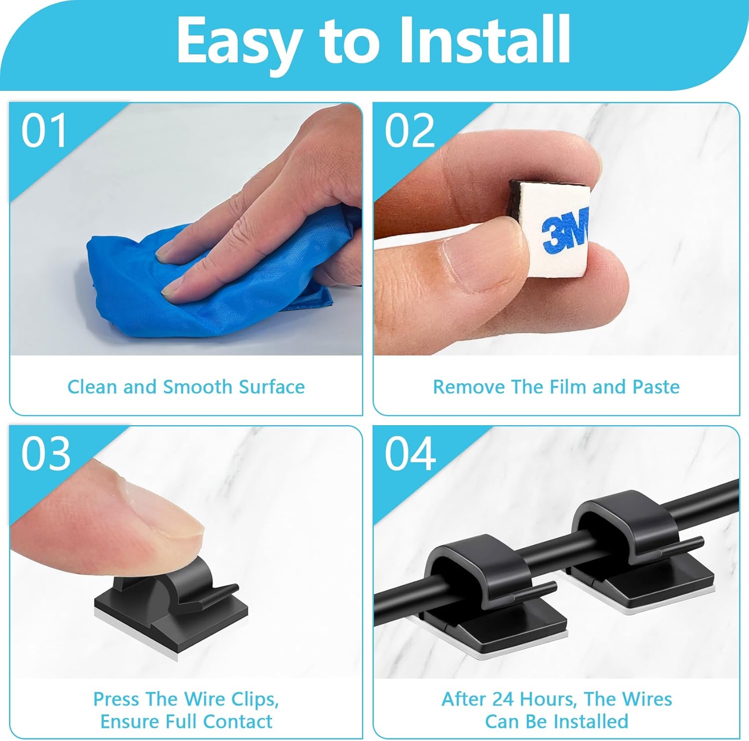 - 【Warm Tips】 Make sure to clean the mounting surface with alcohol pads before you use the wire holder clips, stick them on and press firmly for 30 seconds, and use them after 24 hours for maximum adhesion. As the adhesive is very strong, it is recommended that you use a tool to remove the wire clip, such as a shovel. There will be no residue after removal.