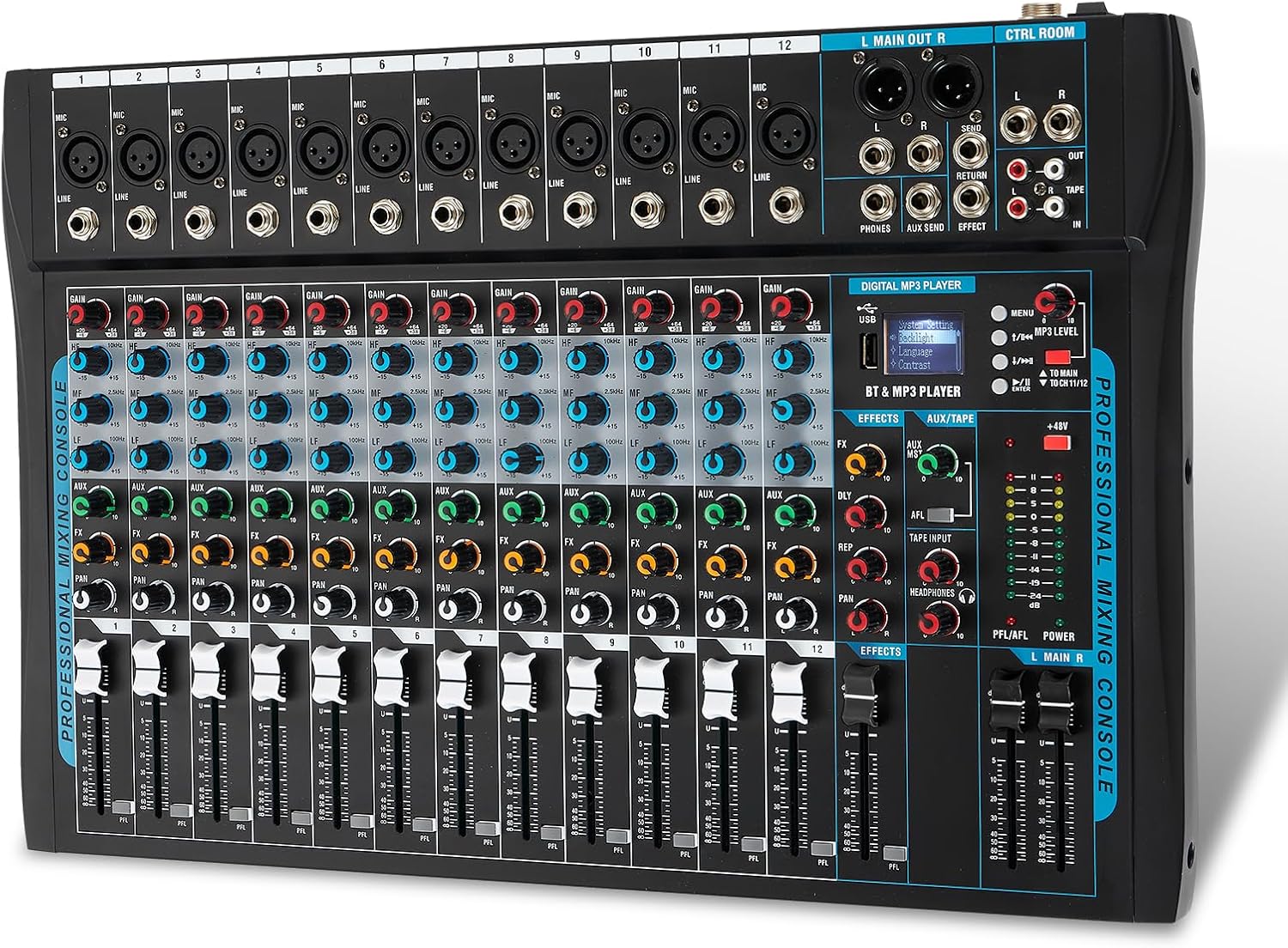 - 【12 Channel Audio Mixer】This advanced audio mixer is made for DJs and music production. With 12 mic inputs, gold-plated XLR and balanced line input jacks, support for balanced XLR inputs, and the option of a built-in 16DSP sound processor, the dj mixer board also features a headphone output jack for private monitoring.