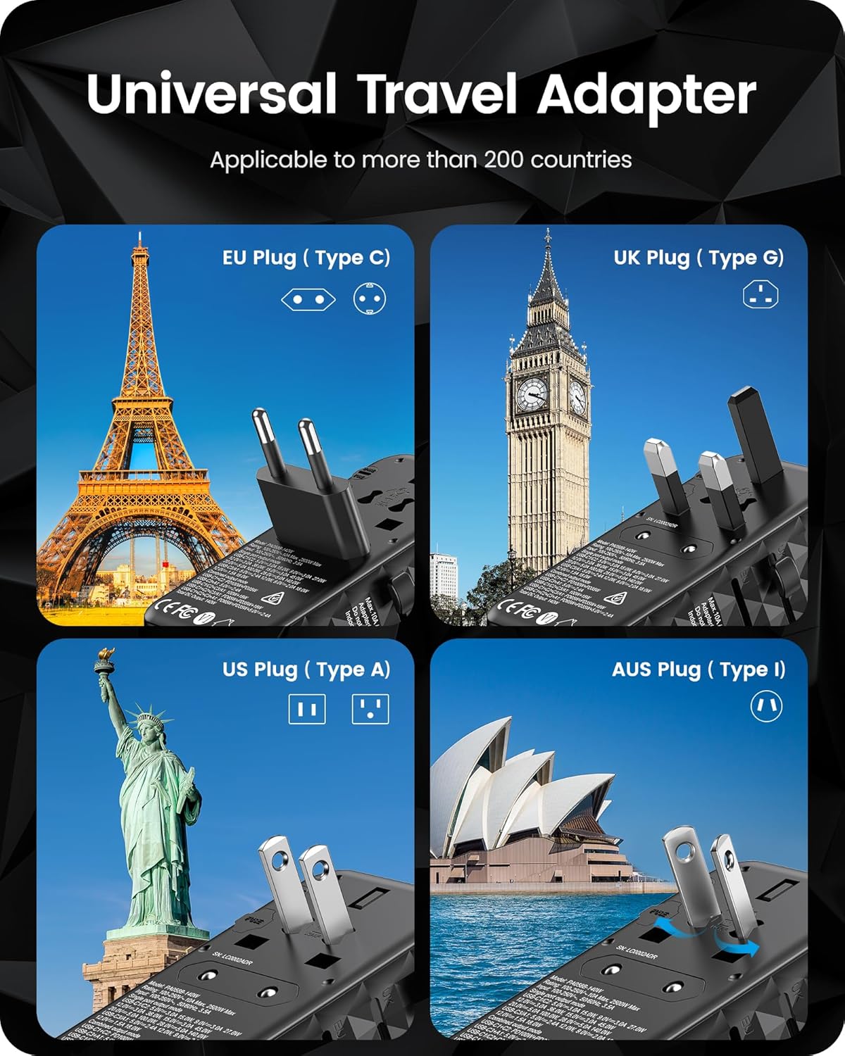 - [International Travel Adapter] This universal plug adapter is designed with 4 integrated plugs: EU, UK, US, and AU (functioned by twisting two prongs of the US plug outwards), accommodating 200+ countries and regions worldwide. A simple press and slide of the intuitive side switches facilitates a smooth extension or retraction of the specific plugs, perfect for frequent travelers or anyone on the go. One adapter works for all your destinations.