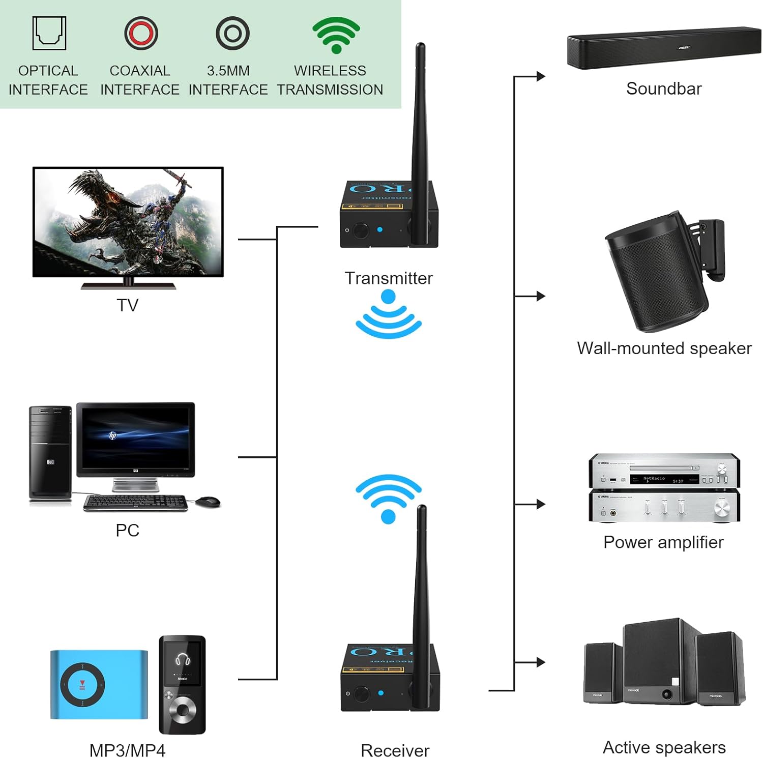1Mii 2.4GHz Wireless Audio Transmitter and Receiver, HiFi Audio, 20ms Low Latency, 320ft Long Range Wireless Subwoofer Kit for Speaker/Stereo/Soundbar,Optical/Coaxial/3.5mm(RCA) Ports.